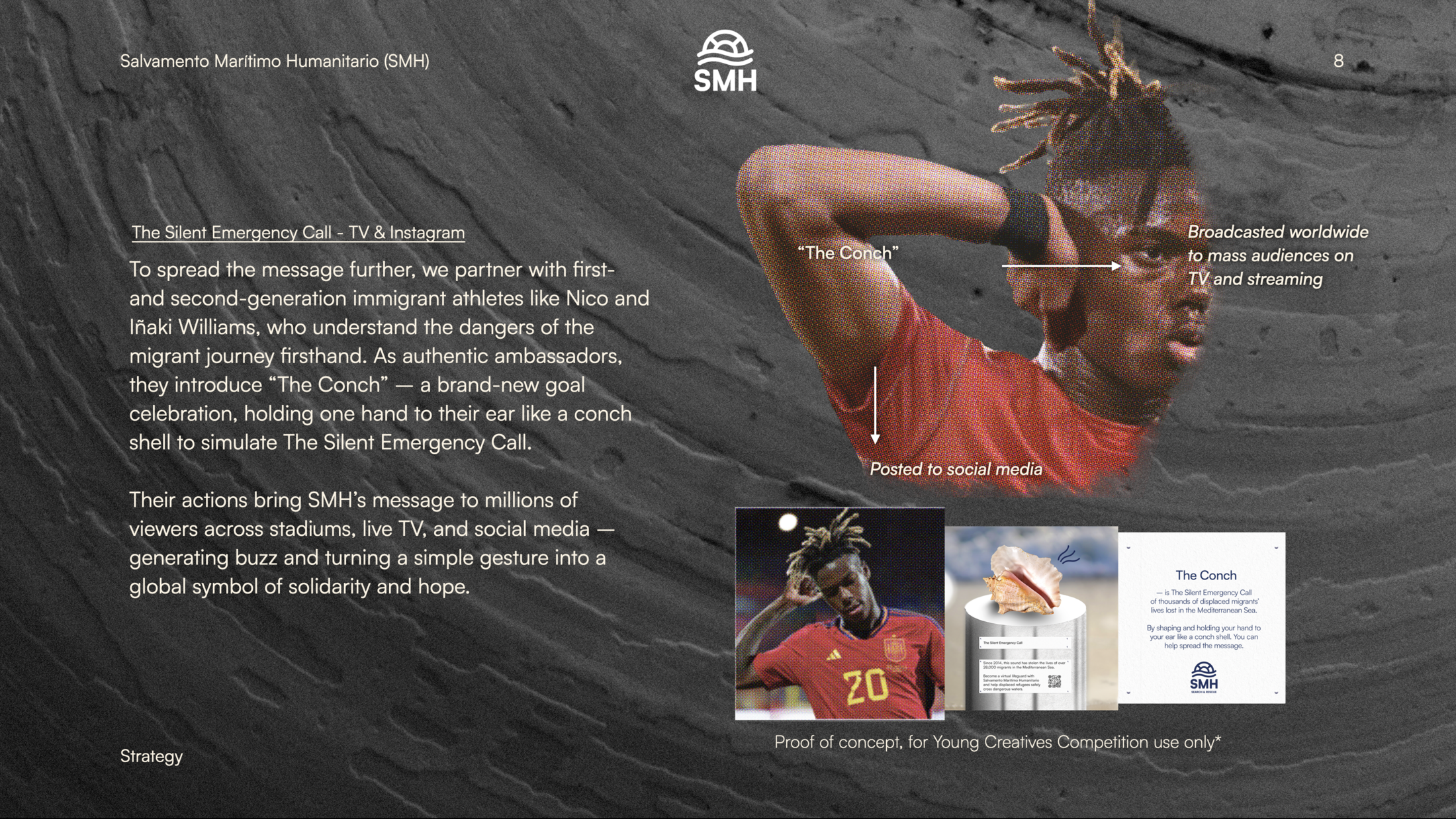 To amplify the call for action, we partner with immigrant athletes like Nico and Iñaki Williams, who know firsthand the importance of receiving the right help. They will introduce "The Conch" – a goal celebration simulating the sound of the ocean by putting one hand onto their ear. Their gesture sparks momentum and resonates with first- and second-generation immigrants, many of whom were once migrants themselves and understand the harsh realities. Broadcast on live TV, and social media, it spreads SMH’s message, turning The Silent Emergency Call into a powerful symbol of solidarity and hope.