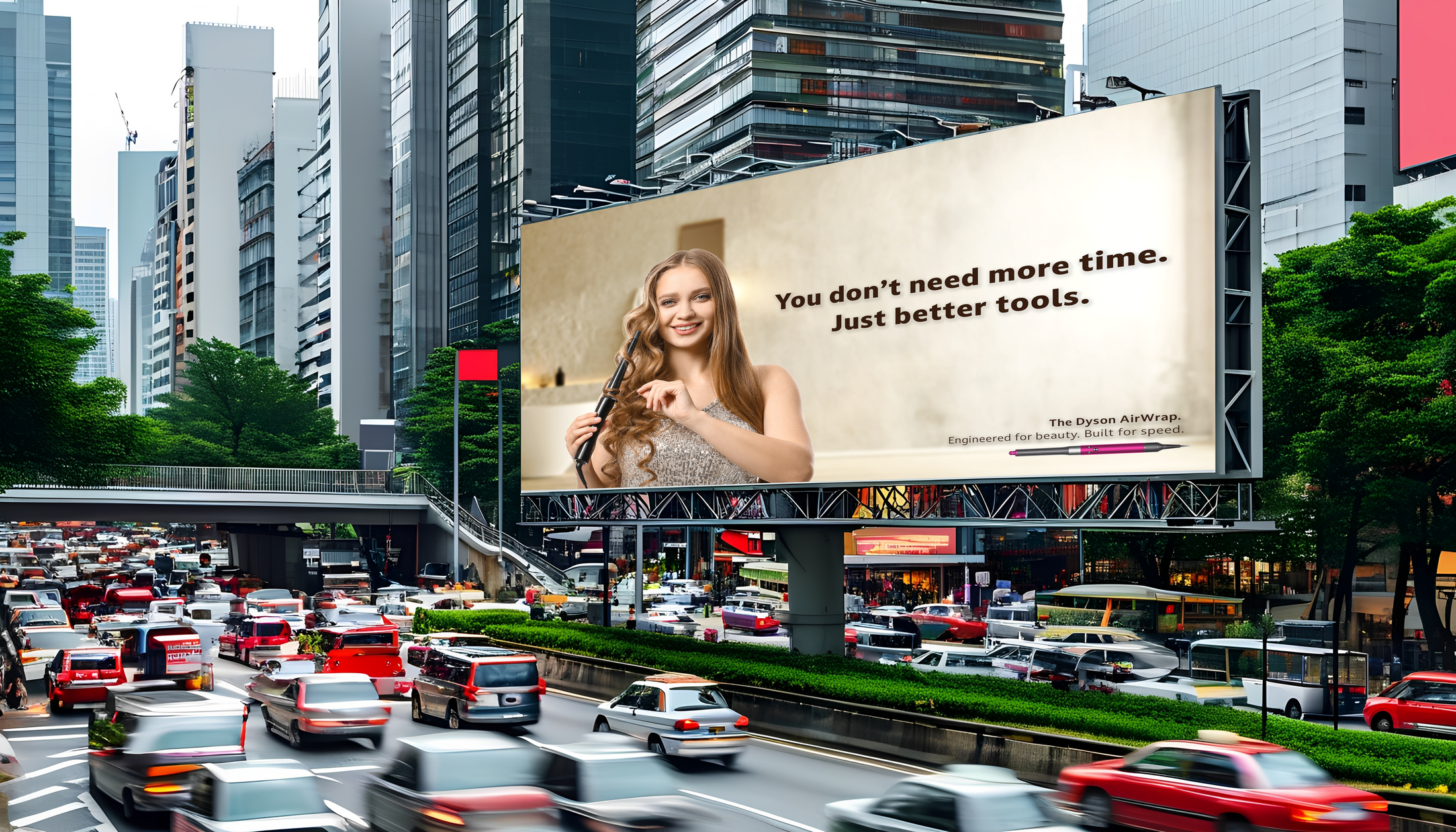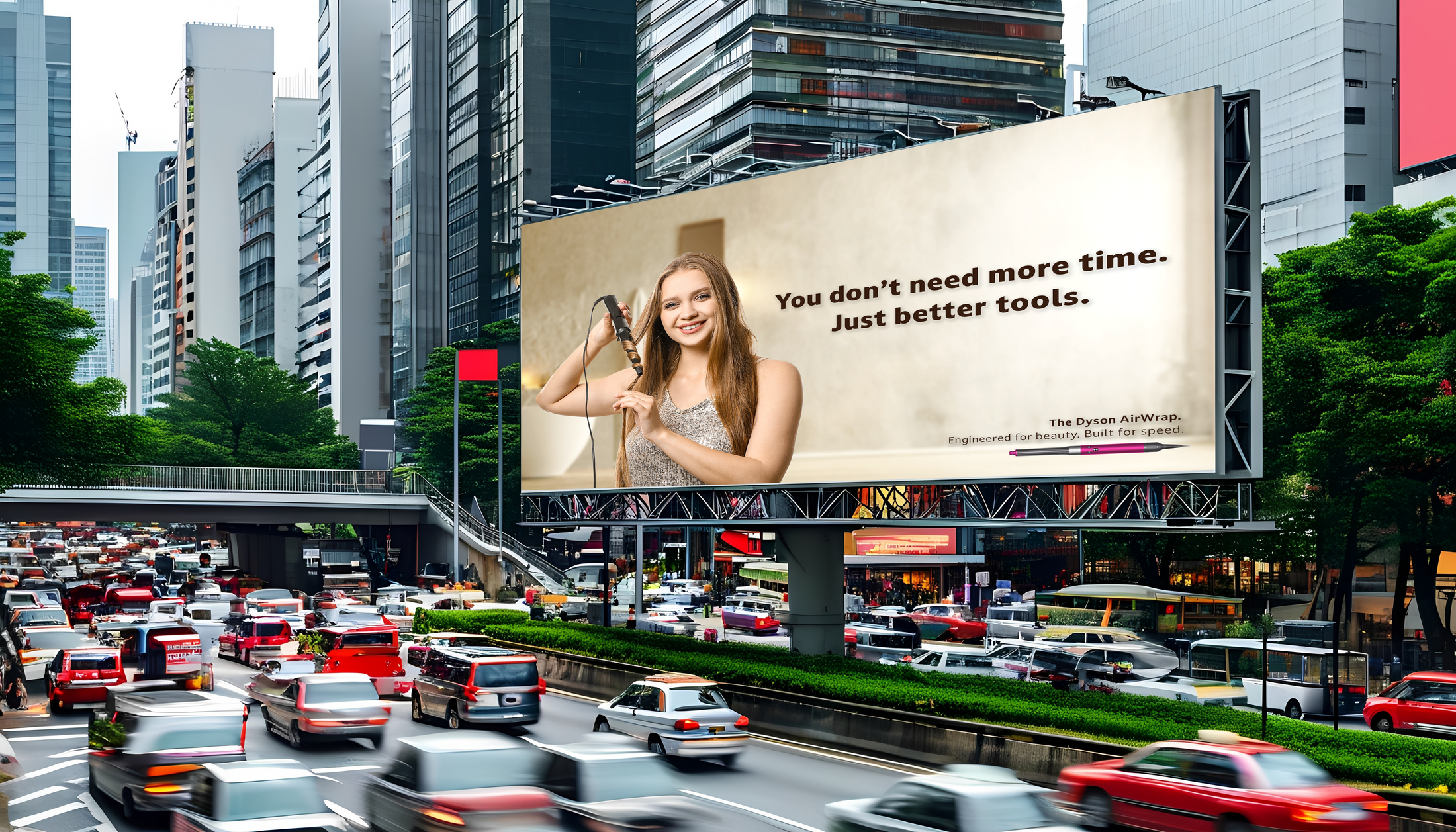 Have a series of billboards in LA by busy intersections that are connected to the traffic light cycle. Every time the light turns red, the billboard triggers a real-time speed styling video of a woman styling her hair with the Dyson Airwrap in the same amount of time as the light.