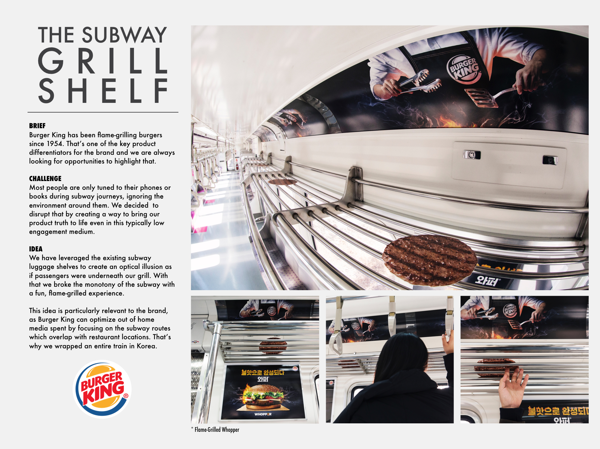 This professional campaign titled 'The Subway Grill Shelf' was published in South Korea in January, 2017. It was created for the brand: Burger King, by ad agency: Cheil. This Ambient medium campaign is related to the Food industry and contains 2 media assets. It was submitted almost 9 years ago.