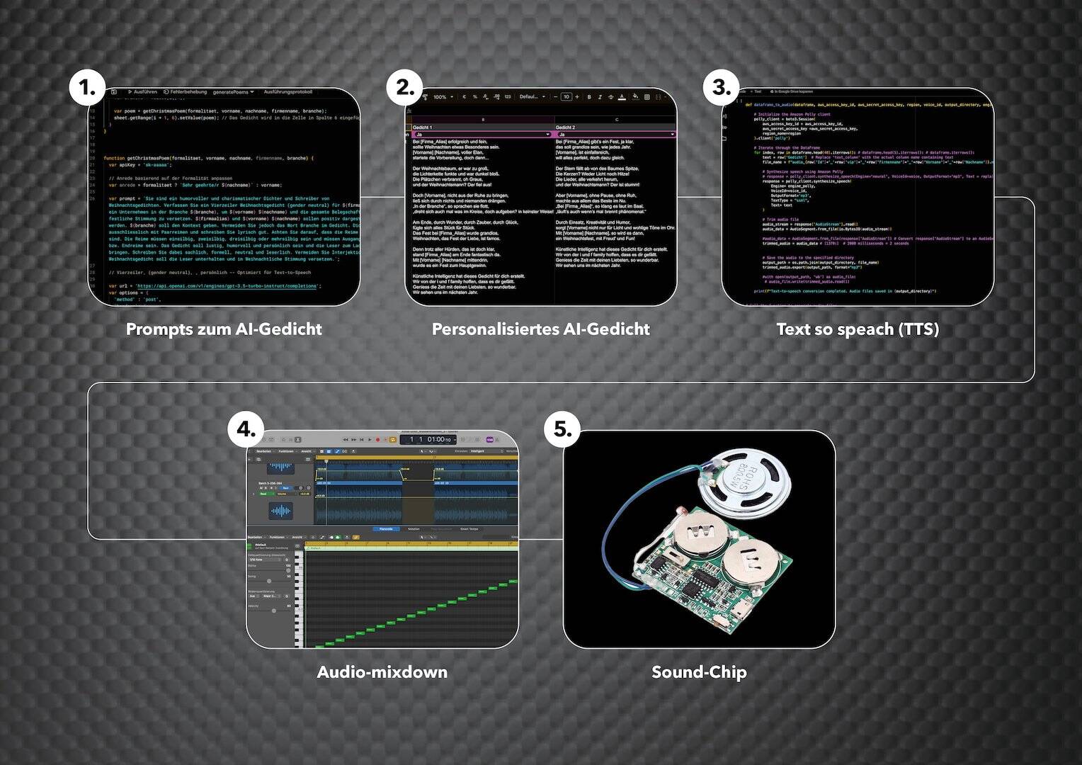 Dozens of prompt variants were tested until the AI generated stories with wit and understanding. The AI was triggered via a Python script, the texts were automatically generated, temporarily stored, naming-coded, read out again and transferred to the text-to-speech engine via API, before being stored on the cloud as audio files in the correct format.