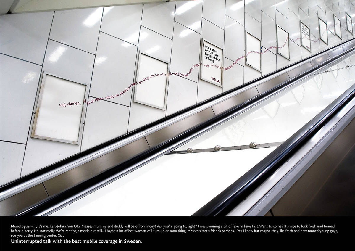 Telia is the biggest operator Sweden, a large country where coverage is important when you chose your mobile operator. If you don’t have good coverage, your phonecalls will be cut off in mid-sentence because of lacking capacity. Telia has the best coverage of all operators, a fact that is known to the public but usually associated to coverage on the countryside, not in the cities. The objective for this campaign is to visualise the superior coverage in a very urban situation and environment: the Subway of Stockholm. The idea is to let a monologue span and move according to the content of the dialouge over big posters to illustrate the payoff: Uninterrupted talk with the best coverage in Sweden. The monologues are carefully written for their individual placement, the poshest area has monologues from posh people and the bohemian area with a bohemian monologue for example. The campaign was widely appreciated for its dual purpose: you don’t need to read the monologue to get the idea but if you take you time to read it, it’s even more fun!