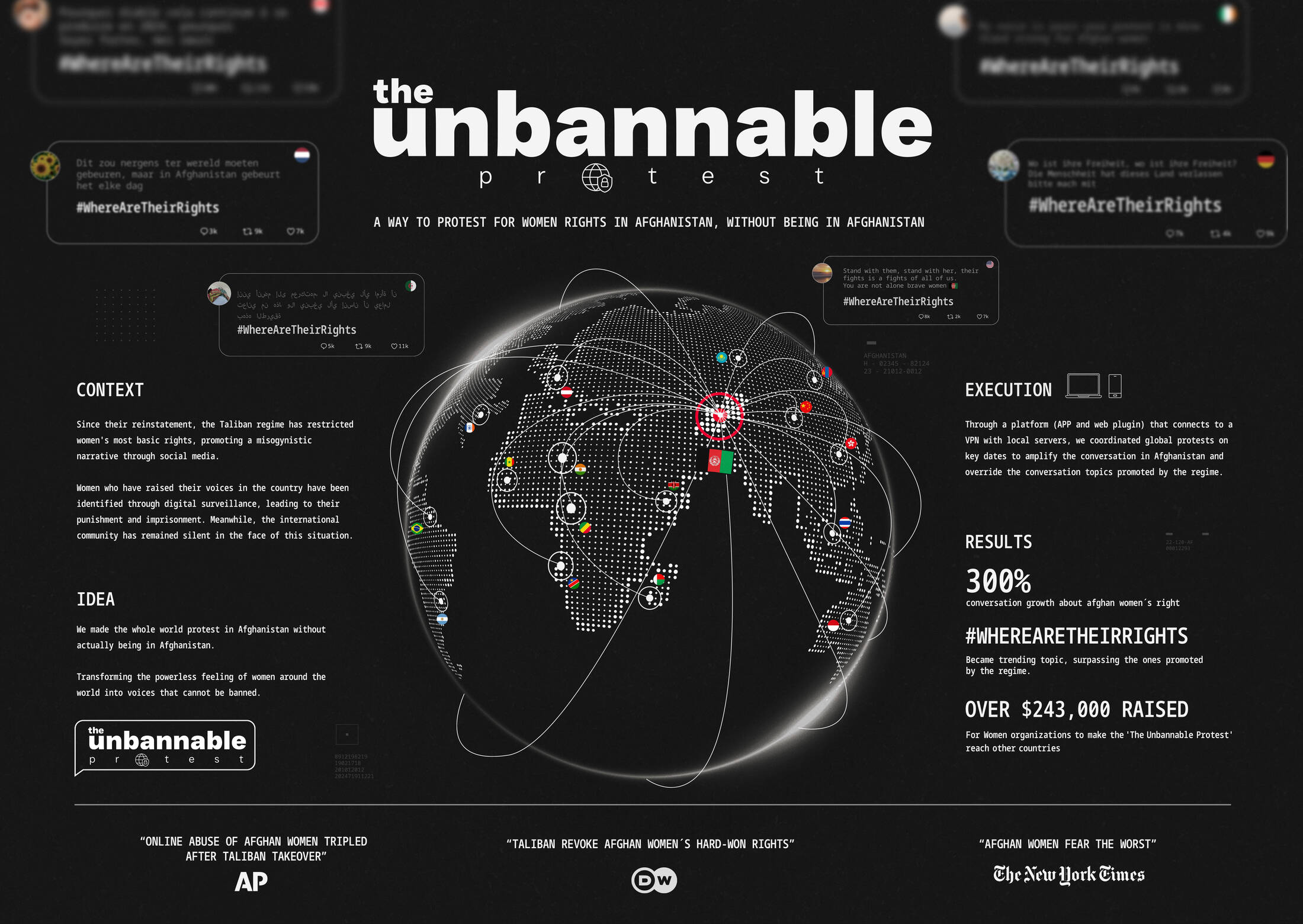 This professional campaign titled 'The Unbannable Protest' was published on November 10, 2023. It was created by ad agency: GRAVITI BBDO. This Digital and Static Images media campaign is related to the Electronics, Technology and Other industries and contains 4 media assets. It was submitted about 1 year ago by Creative Director: Joaquín Martínez of GRAVITI BBDO Guatemala.