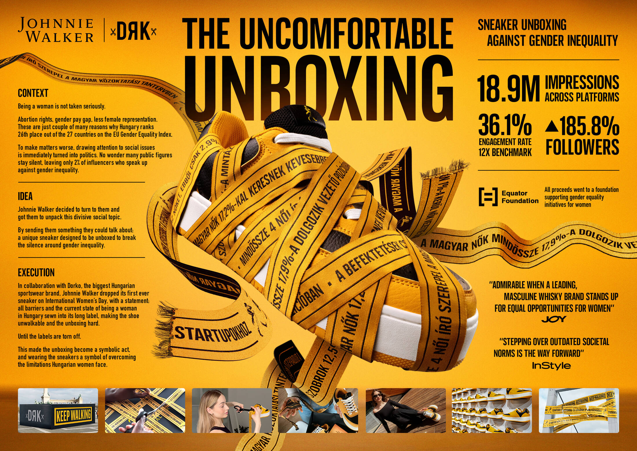Creative Idea: Recognizing that only 2% of influencers engage in discussions on gender inequality, Johnnie Walker and Dorko, Hungary's largest sportswear brand, created a unique sneaker. These sneakers had excessively long labels detailing the barriers and limitations women face in Hungary, which needed to be cut off before the sneakers could be worn. This act symbolized breaking the silence and overcoming limitations.