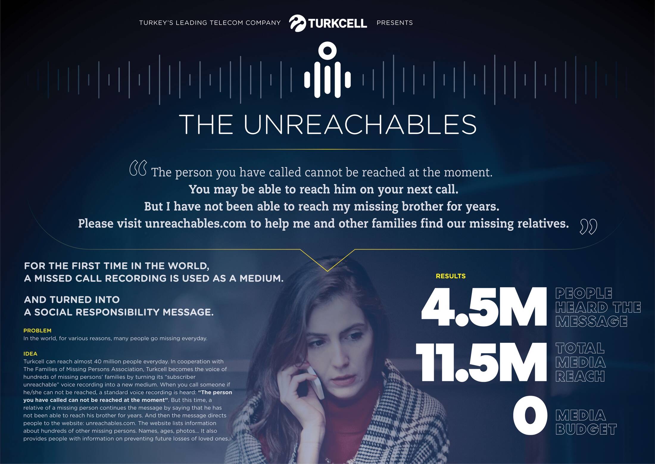 This professional campaign titled 'The Unreachables' was published in Turkey in June, 2019. It was created for the brand: Turkcell, by ad agency: TBWA. This Digital medium campaign is related to the Electronics, Technology and Public Interest industries and contains 2 media assets. It was submitted over 6 years ago.