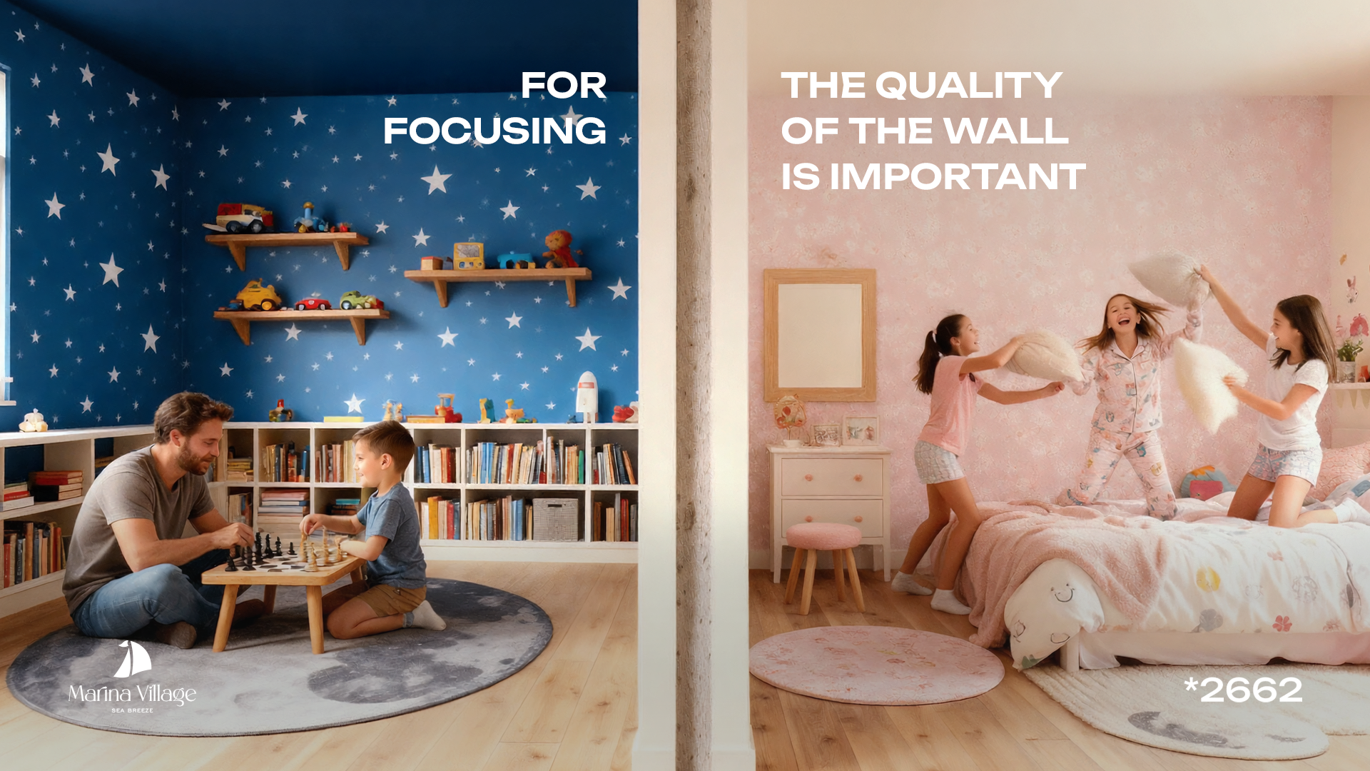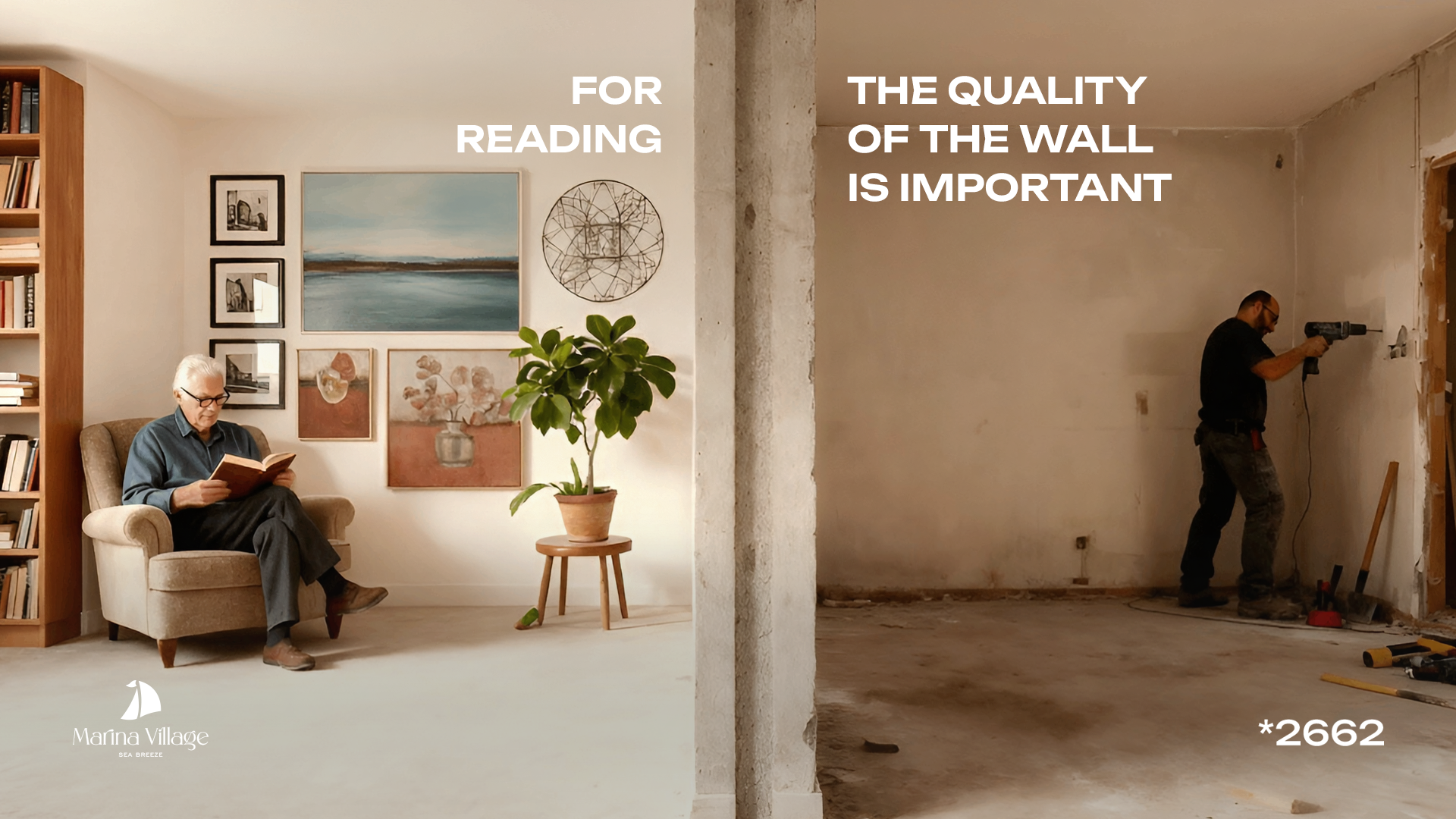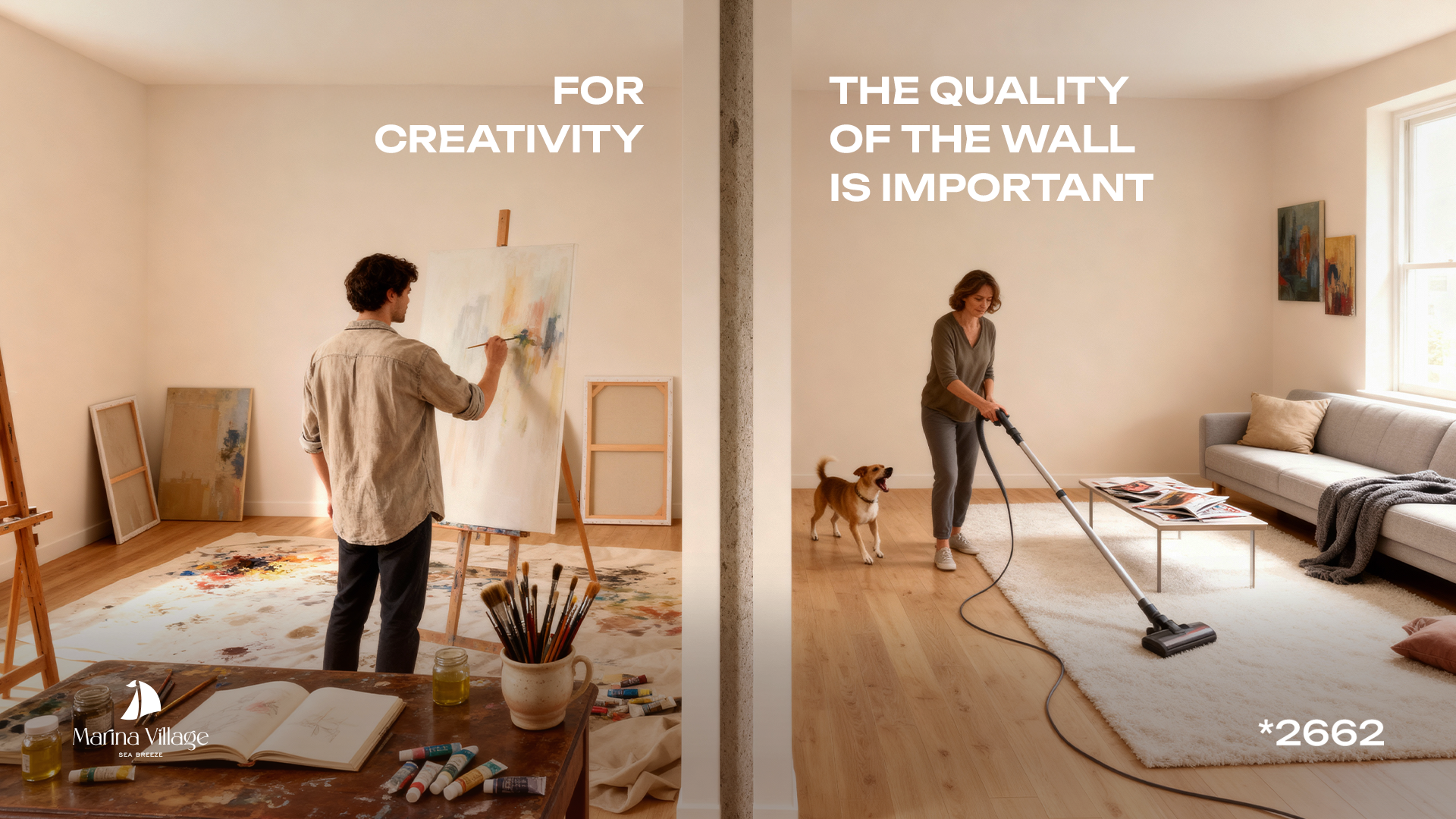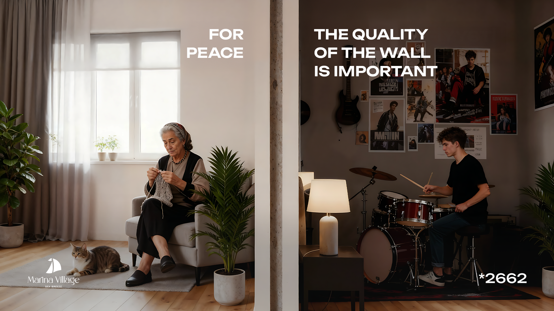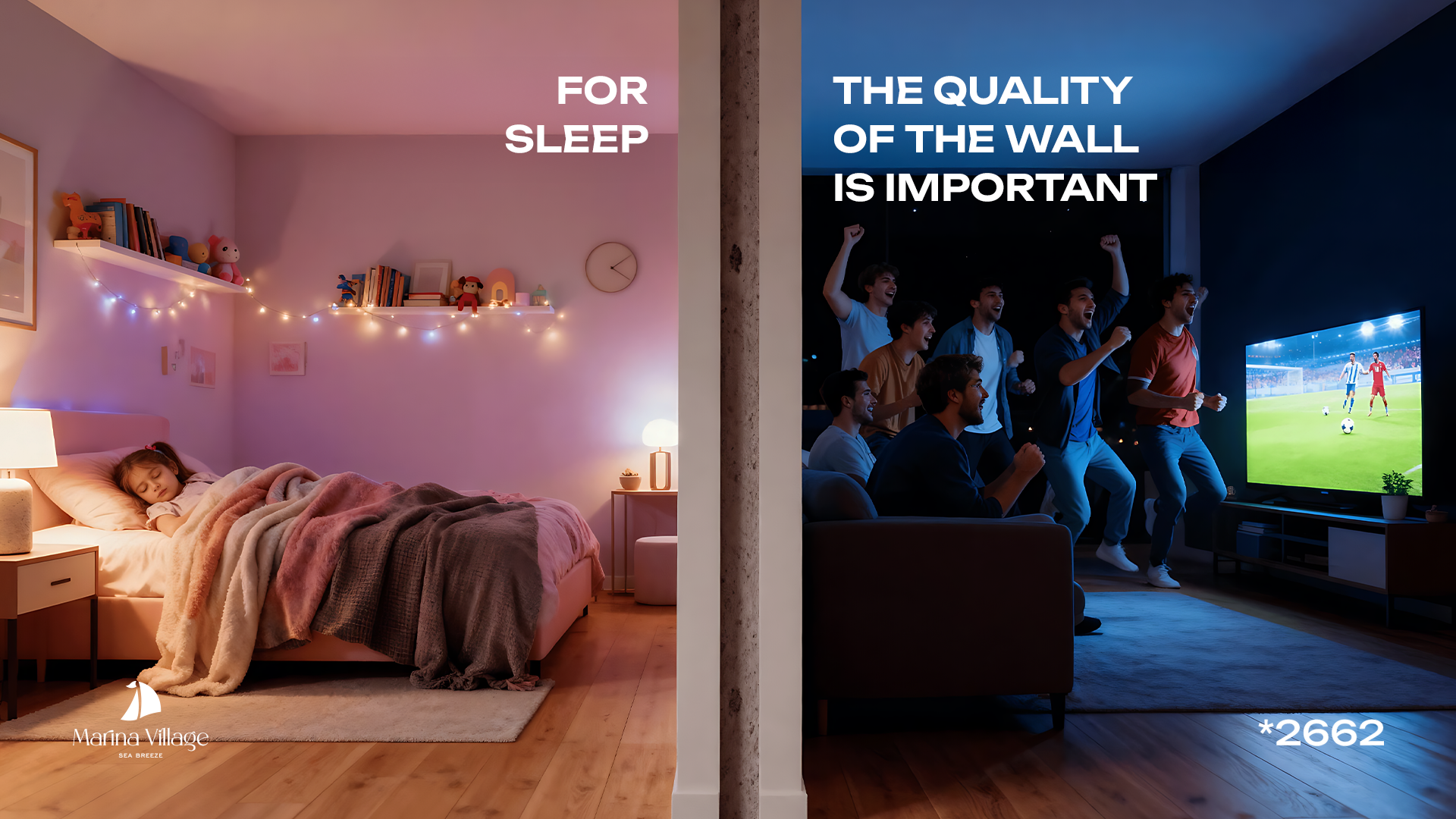 The stark contrast emphasizes that the only thing standing between your peace and someone else's chaos is the quality of the wall. At Marina Village, we prioritize superior sound insulation to ensure that your home remains a private sanctuary.