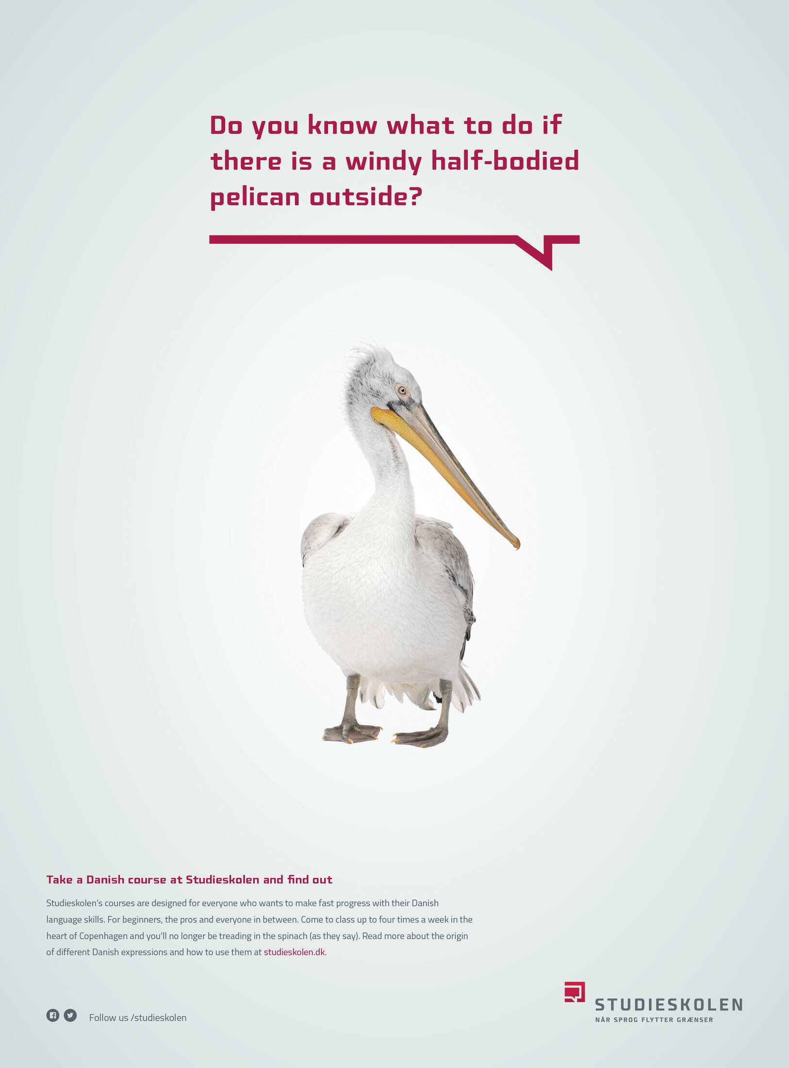 This professional campaign titled 'The windy pelican' was published in Denmark in February, 2017. It was created for the brand: Studieskolen, by ad agency: Askvig Stitz. This Print medium campaign is related to the Alcoholic Drinks and Education industries and contains 1 media asset. It was submitted almost 9 years ago.
