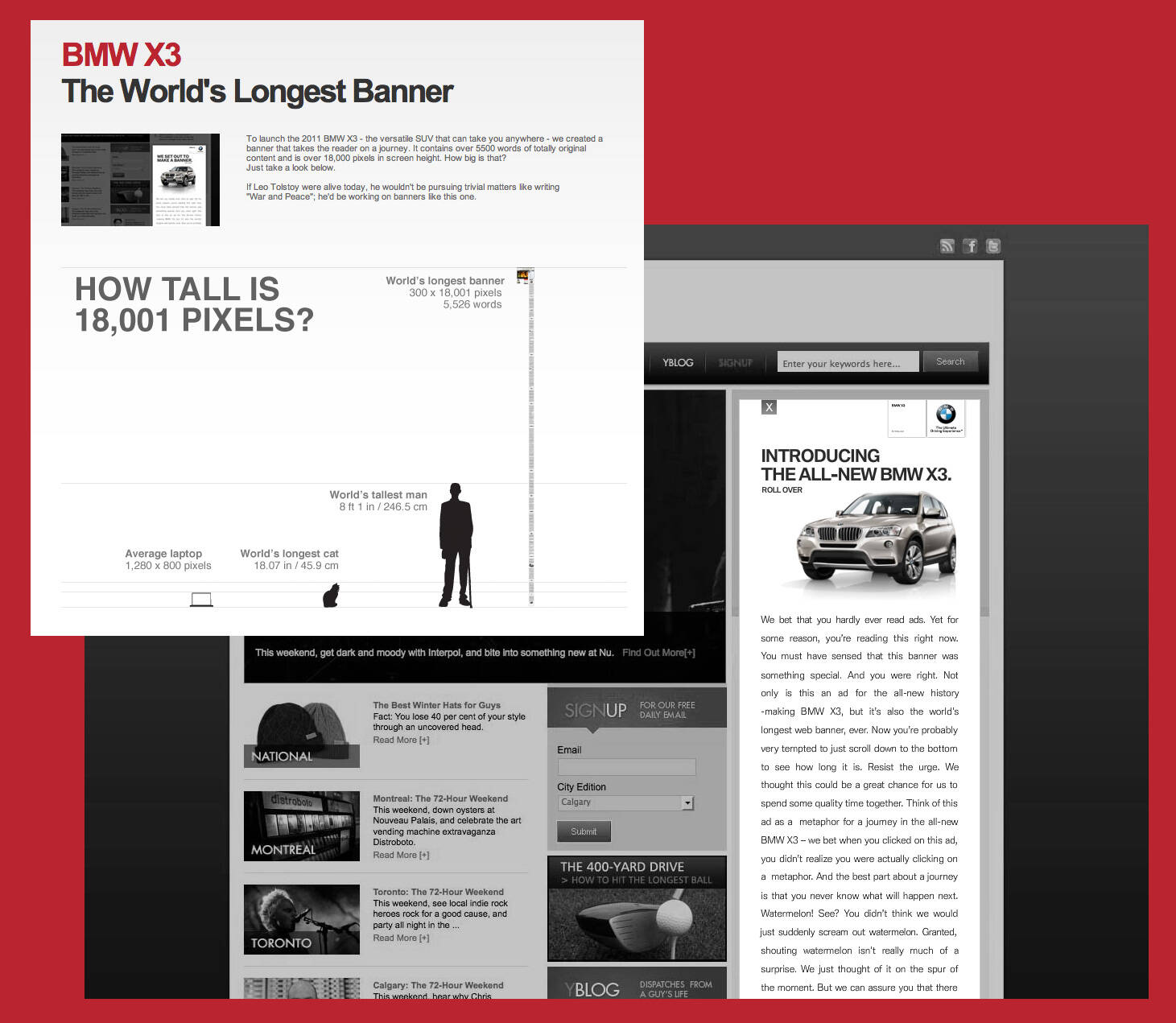 This professional campaign titled 'The World's Longest Banner' was published in Canada in February, 2011. It was created for the brand: BMW, by ad agency: Cundari. This Digital medium campaign is related to the Automotive and Personal Transportation industry and contains 1 media asset. It was submitted almost 15 years ago.