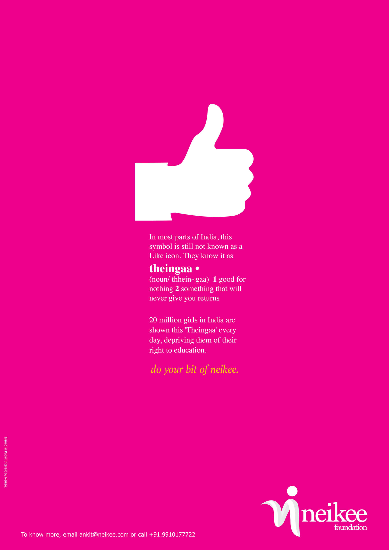 As people living in urban cities, all we do is shun away from our responsibilities when it comes to supporting the education of a girl child. We always find the easy way out by logging on to social networking sites and clicking on the 'THUMBS UP' icon that says Like. In India, the same thumbs up icon is also called 'THEINGAA' meaning good for nothing or something that never yield results. So, when the question of empowering a girl child arise, countless people of our nation show the proverbial 'Theingaa'. The 2 posters show a similar intent and are aimed at creating a stark visual imagery that catches the viewer's attention.