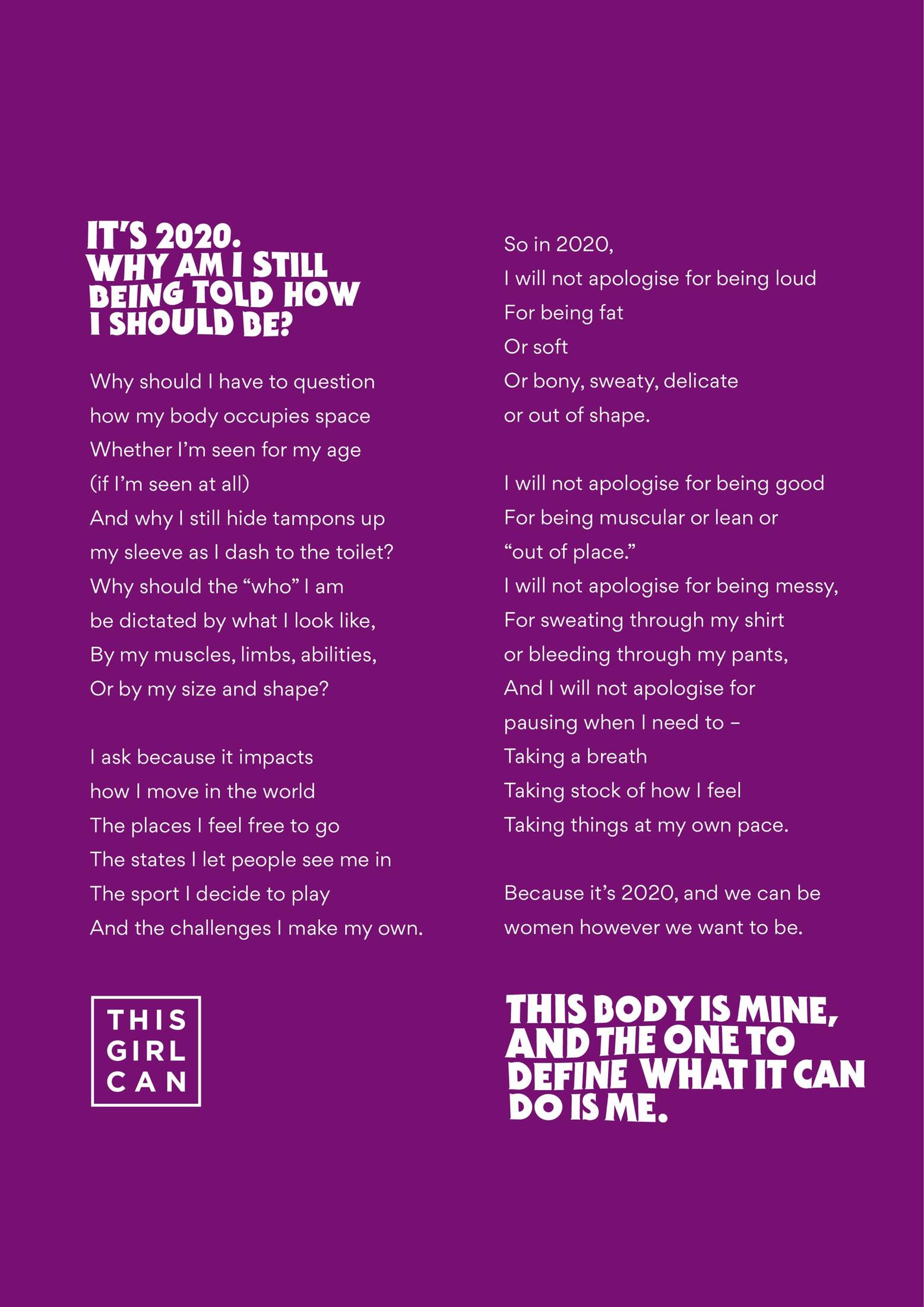 This professional campaign titled 'This Girl Can 2020' was published in United Kingdom in January, 2020. It was created for the brand: Sport England, by ad agency: FCB. This Film medium campaign is related to the Public Interest industry and contains 2 media assets. It was submitted almost 6 years ago.