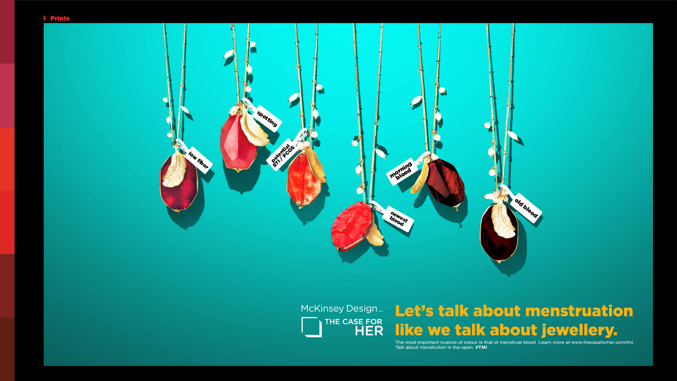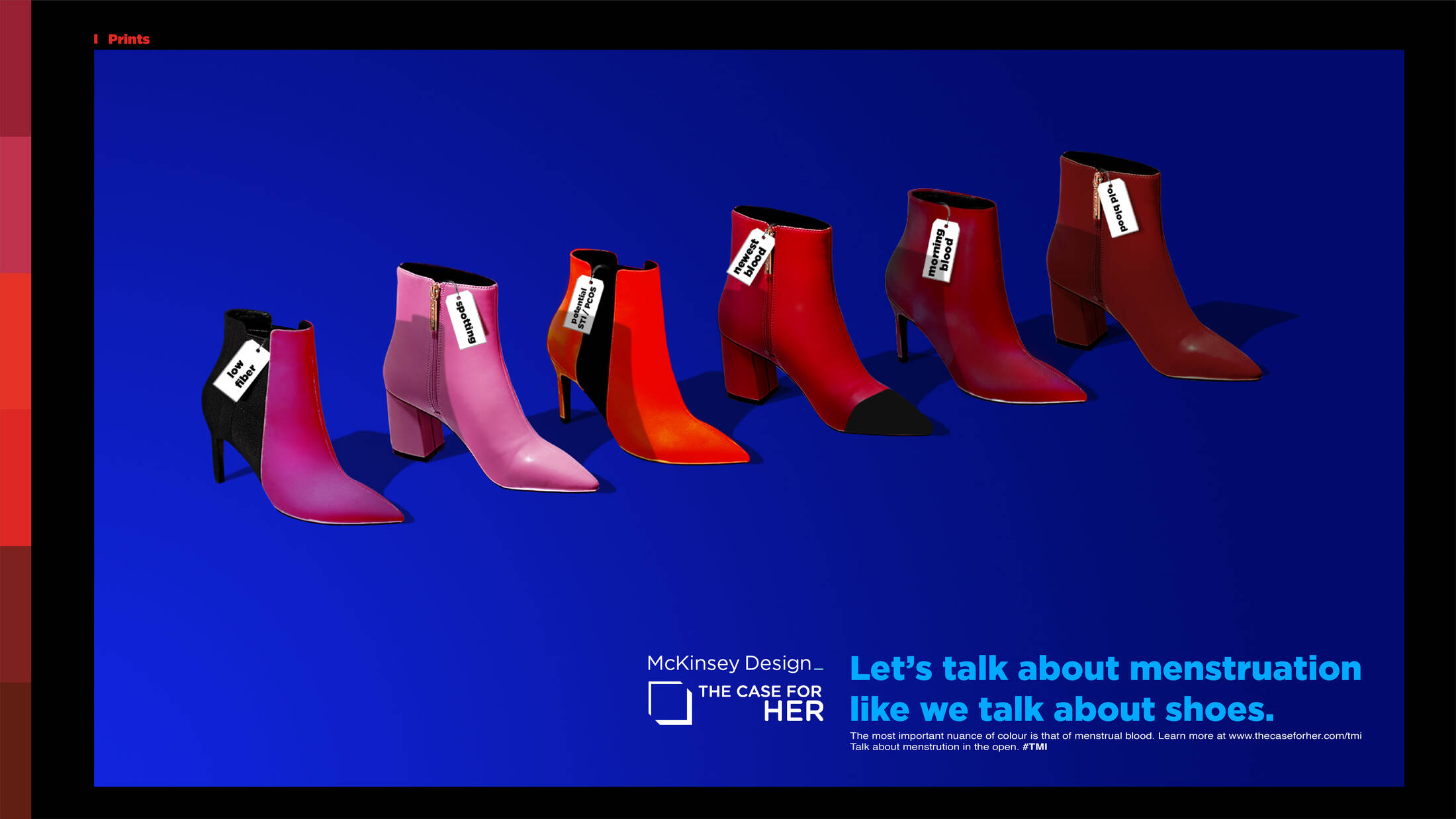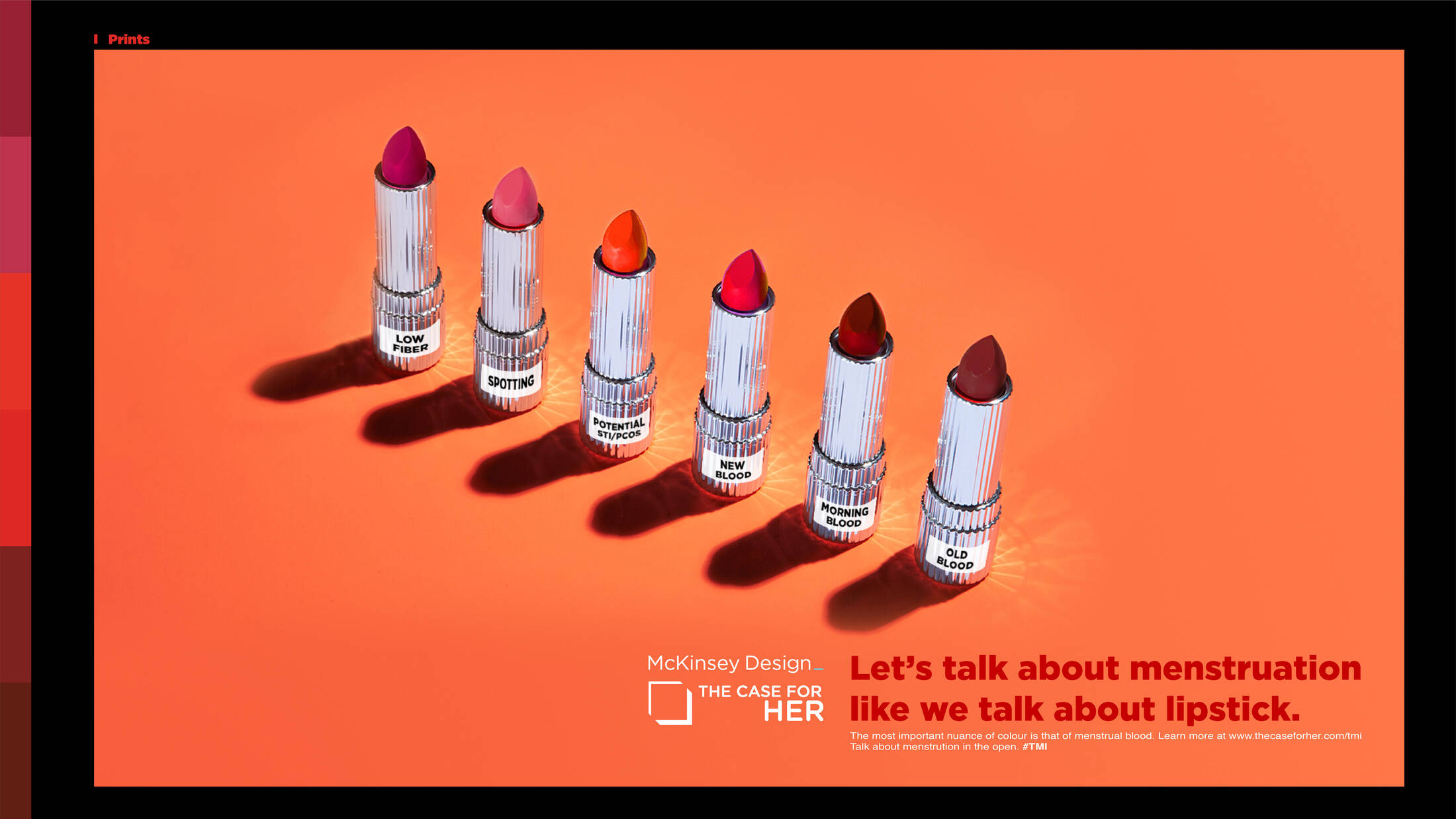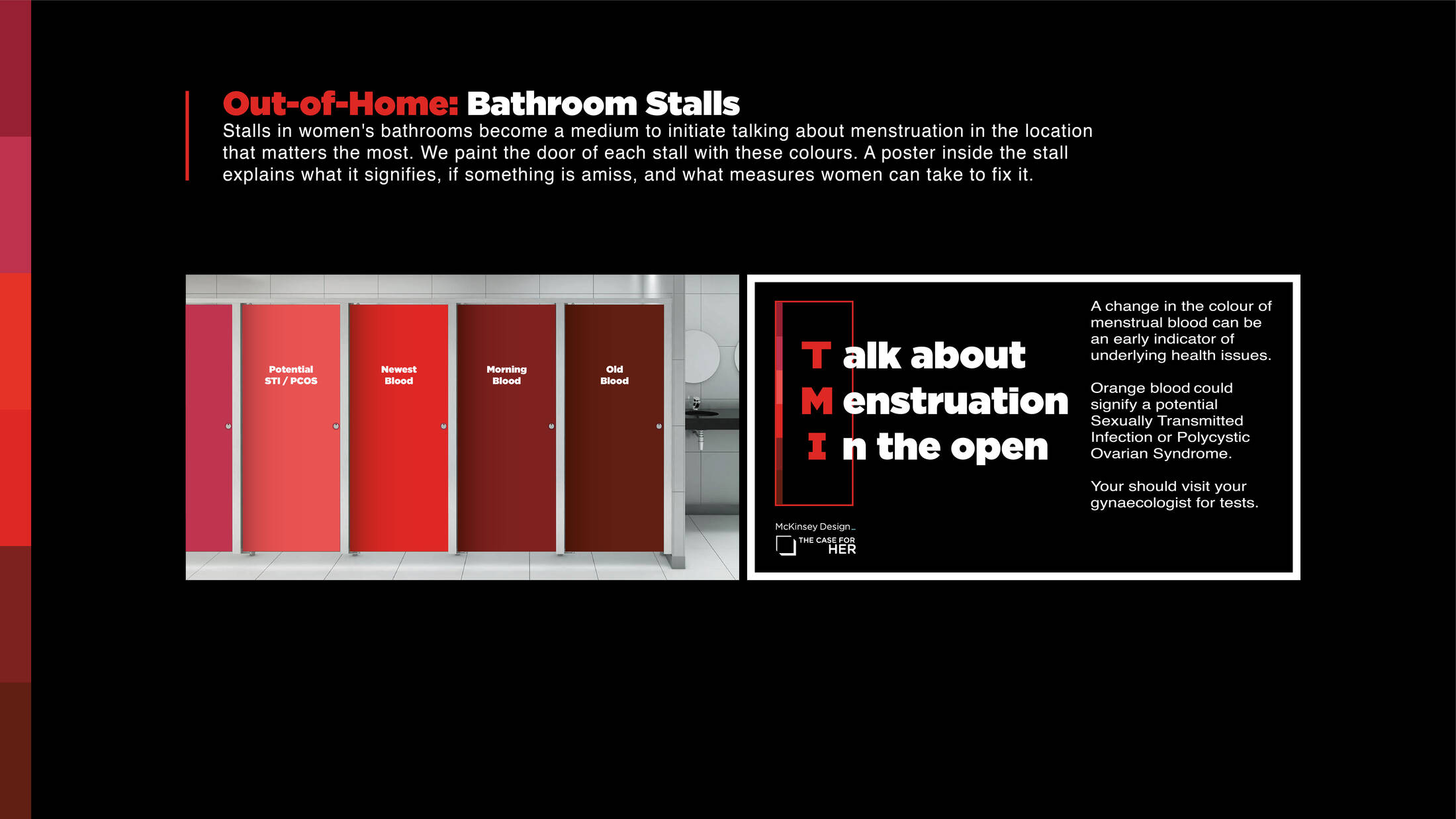 Talking about menstruation is largely a social and cultural taboo. McKinsey in partnership with The Case For Her wants to tackle issues and social stigmas around menstruation. Women themselves have internalised the stigma related to menstruation to the extent that they refrain from talking about it openly and certainly not in detail. Normally women are extremely particular about nuances in colours. However, when it comes to periods, women refrain from talking about the different shades of menstrual blood. Research shows that a change in colour can be an early indicator of underlying health issues - a conversation we shouldn't be shying away from. In order to execute the same we use various touch points that women encounter and talk about anyway, to normalise the "uncomfortable" period conversation.