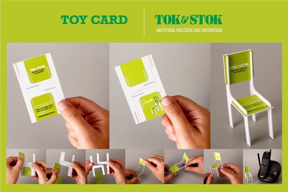 Going to a store and taking a business card is customary. Now, what you can do with it is what varies. Tok&Stok turned their business card in a entertainment. To allude to their easy to assemble furniture, the brand launched an unprecedented action that converts the business card in a little chair. To do so is very simple: just detach the parts marked and put them together. The back of the card has the logo, while the seat takes the essential information such as address and phone number.