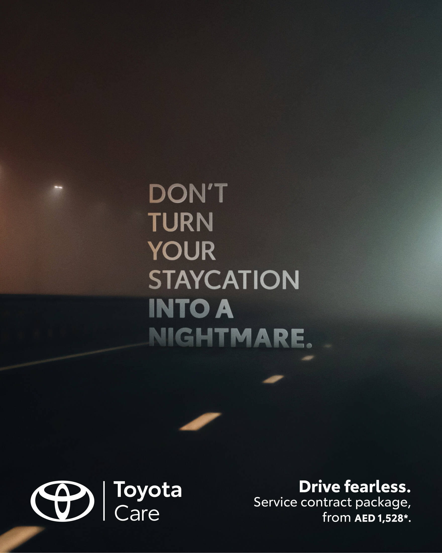 This professional campaign titled 'Toyota Care | Nightmare' was published in United Arab Emirates in October, 2021. It was created for the brand: Al-Futtaim Motors - Toyota, by ad agency: Ogilvy. This Print medium campaign is related to the Automotive and Personal Transportation industry and contains 3 media assets. It was submitted about 4 years ago by Associate Business Director: Kenneth Daniel Monis of Saatchi & Saatchi Middle East.