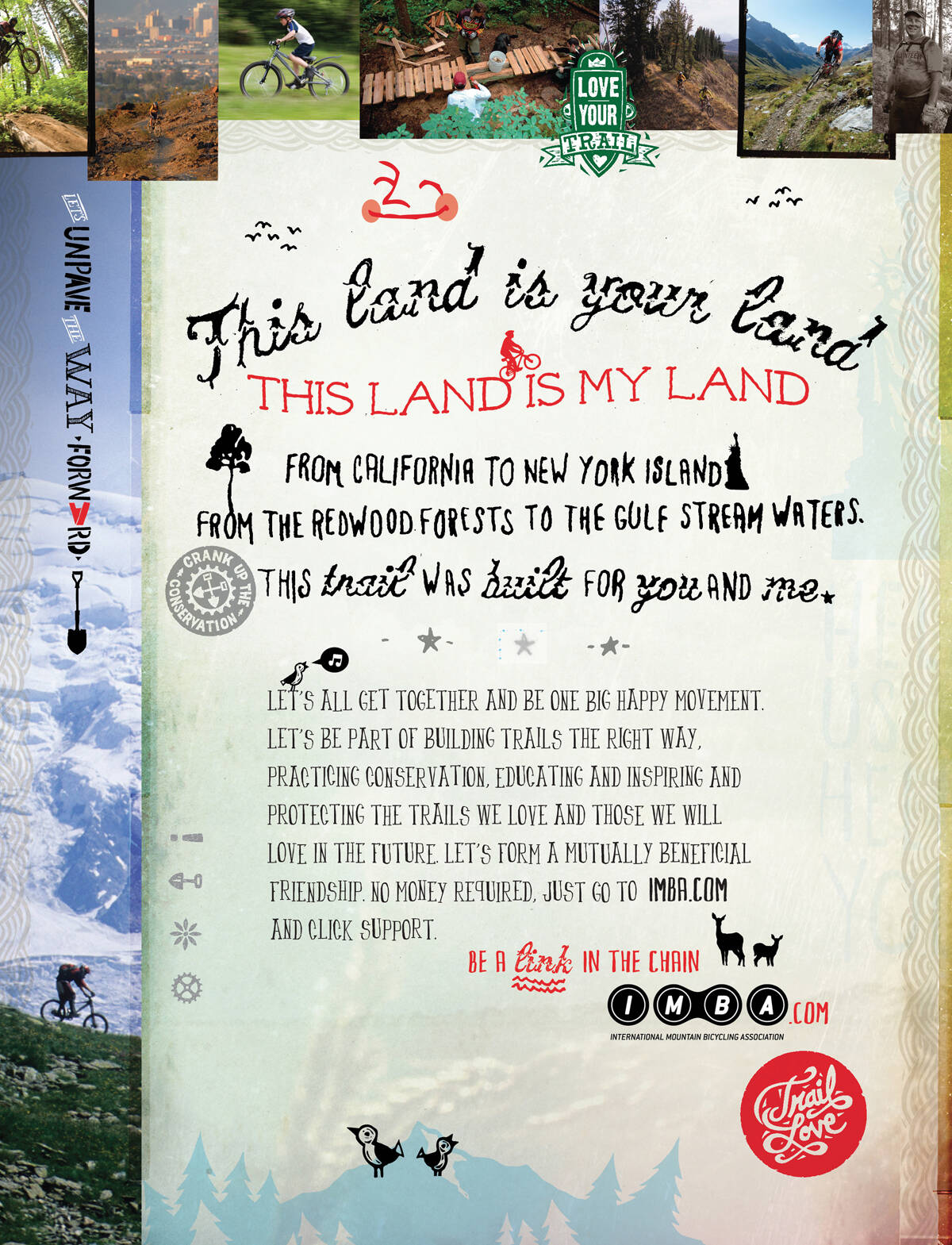 This professional campaign titled 'Trail Love' was published in United States in August, 2011. It was created for the brand: International Mountain Bicycling Association, by ad agency: Cultivator. This Print medium campaign is related to the Recreation, Leisure industry and contains 3 media assets. It was submitted over 14 years ago.