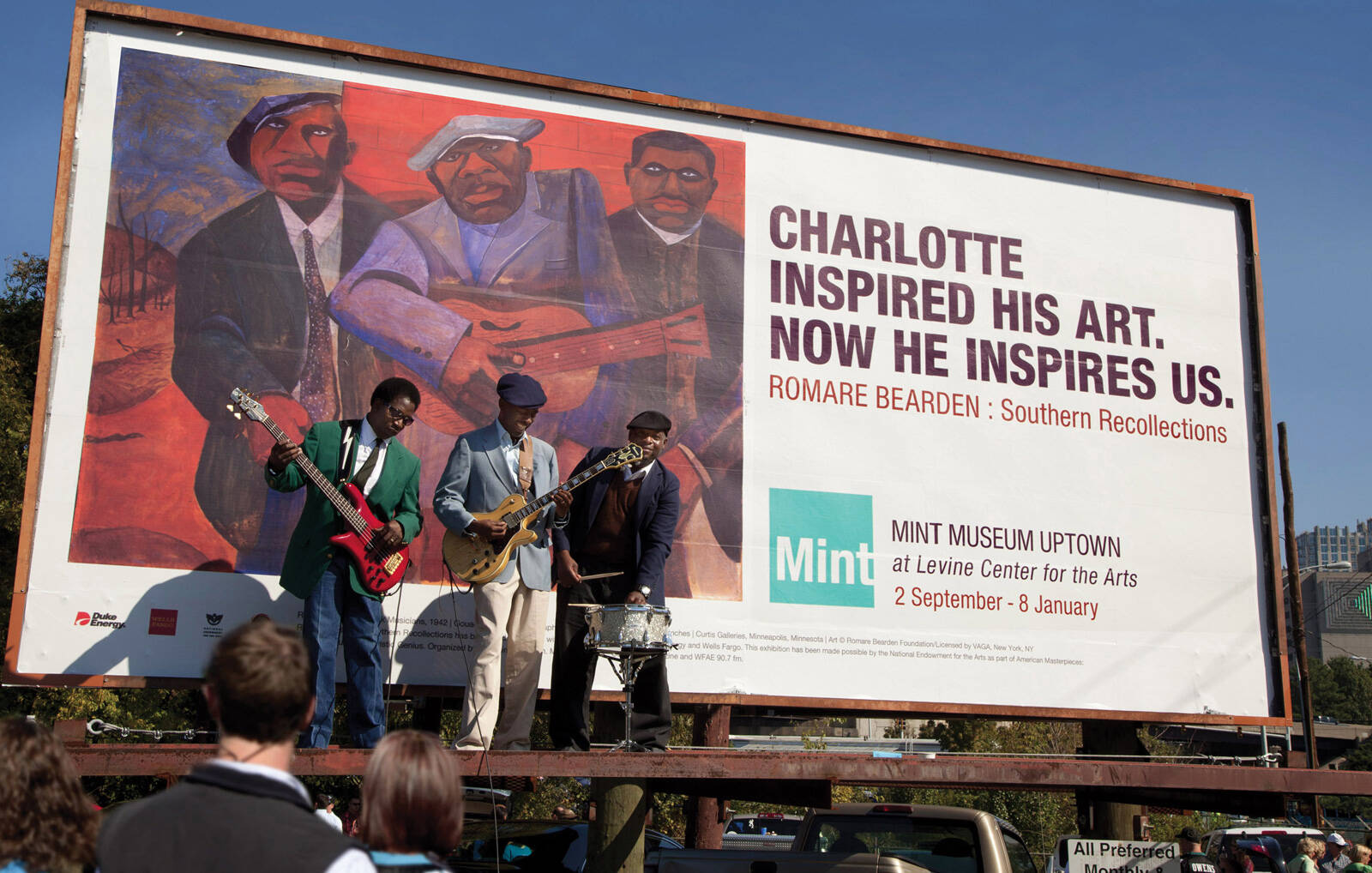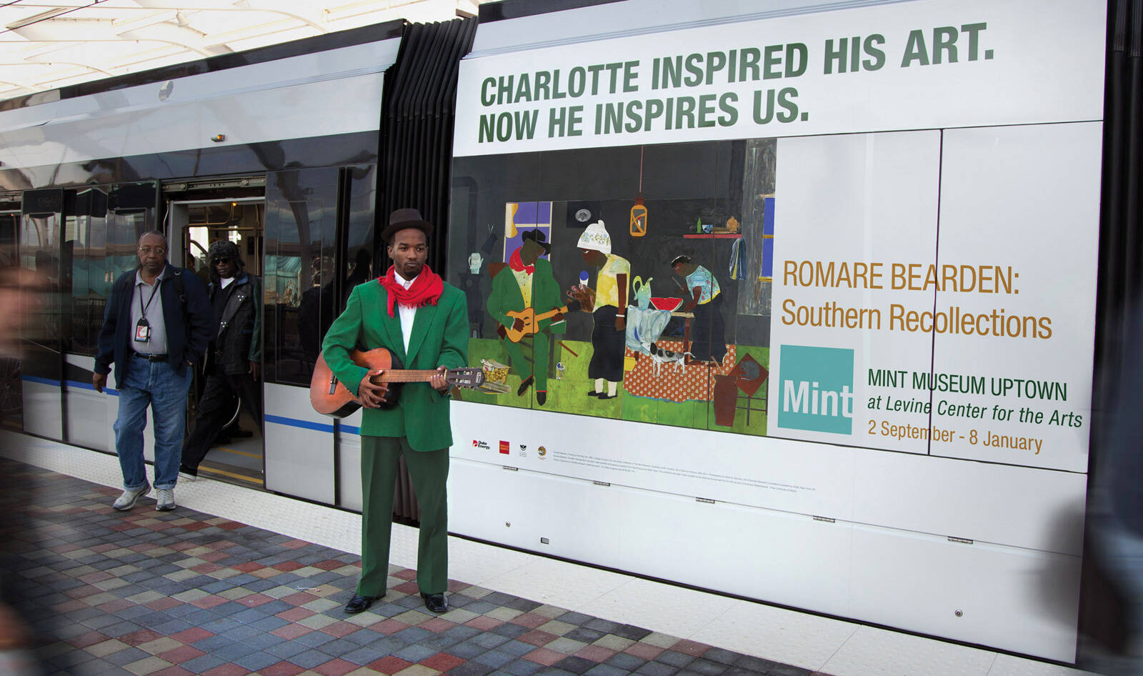 Live musicians—dressed exactly as in the Romare Bearden paintings that appear on transit wrap and billboard advertising for the exhibit—stand and play in front of the 2-D advertising, both as the trains come in, and on an elevated platform in front of a billboard.