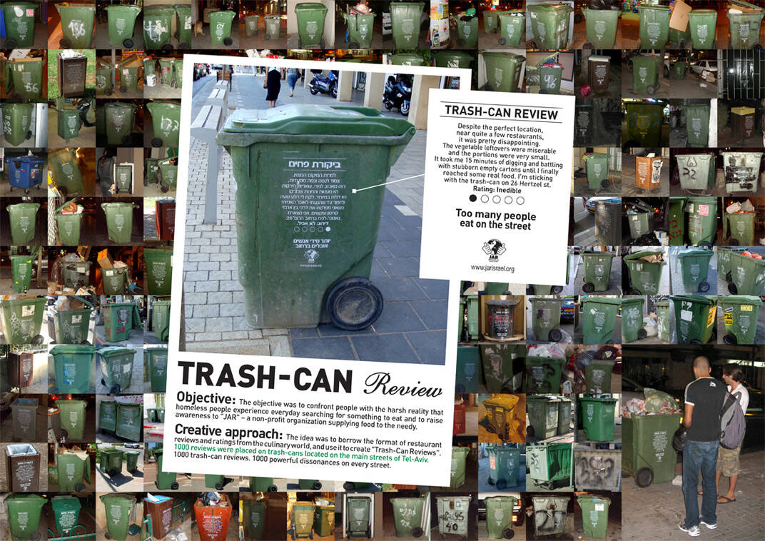 This professional campaign titled 'Trash can review' was published in Israel in September, 2009. It was created for the brand: JAR, by ad agency: Y&R. This Ambient medium campaign is related to the Public Interest industry and contains 1 media asset. It was submitted about 16 years ago.