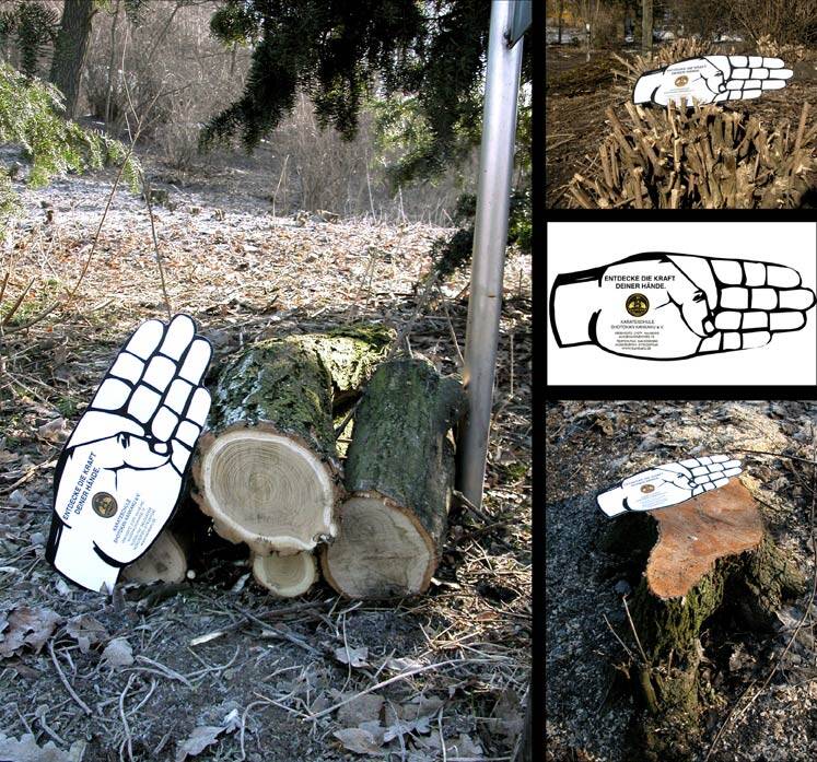 Lot of trees in the city get truncated at wintertime. Chopped branches and stumps were used to place advertising signs on them. The signs were shaped like hands and labeled with the headline: