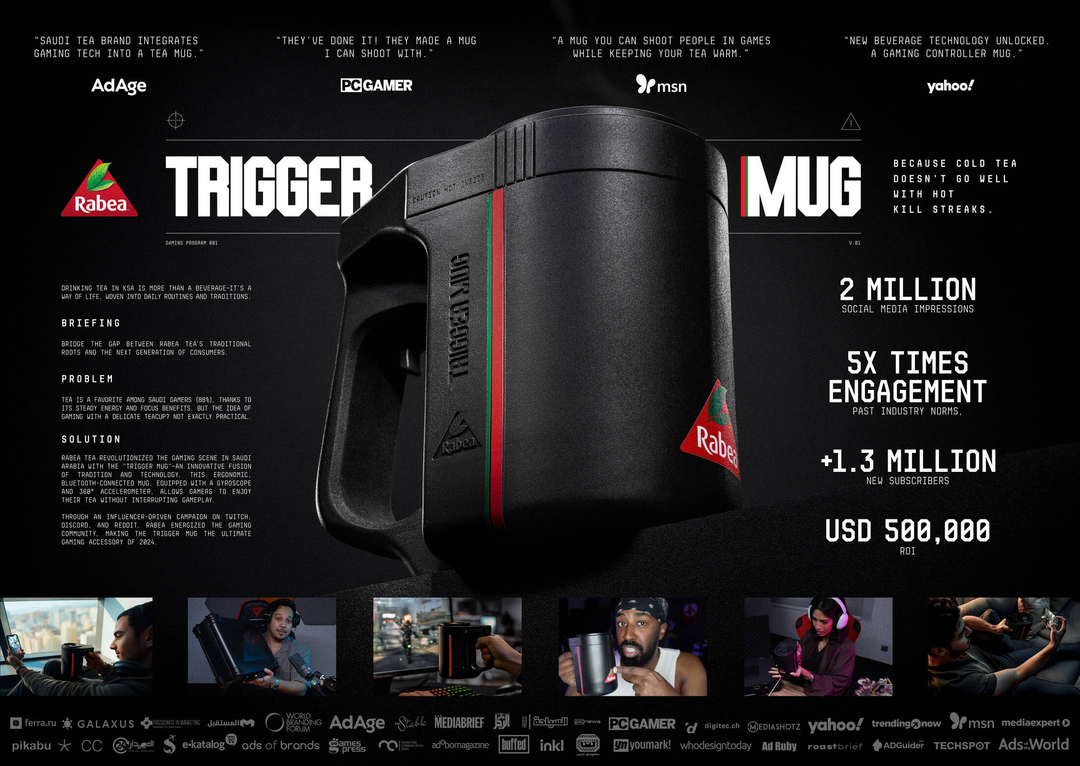 This professional campaign titled 'Trigger Mug Case' was published in Saudi Arabia in December, 2024. It was created for the brand: Rabea Tea, by ad agency: Webedia KSA. This Design medium campaign is related to the Food industry and contains 4 media assets. It was submitted 10 months ago by Executive Creative Director: Saadi of Webedia.