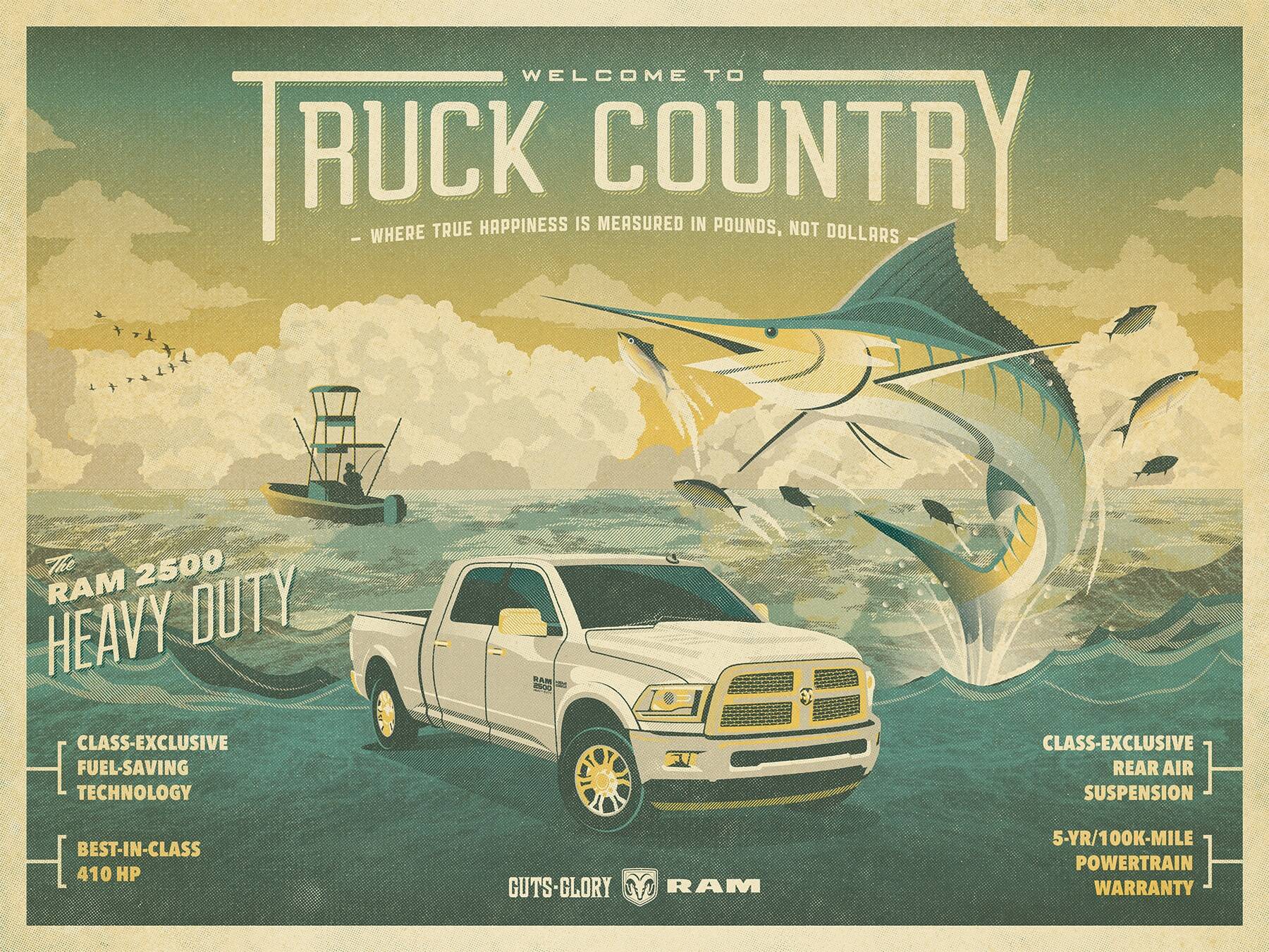 This professional campaign titled 'Truck Country - camping, Truck Country - fishing, Truck C...' was published in United States in July, 2014. It was created for the brand: RAM, by ad agency: TRG. This Print medium campaign is related to the Automotive and Personal Transportation industry and contains 4 media assets. It was submitted almost 11 years ago.