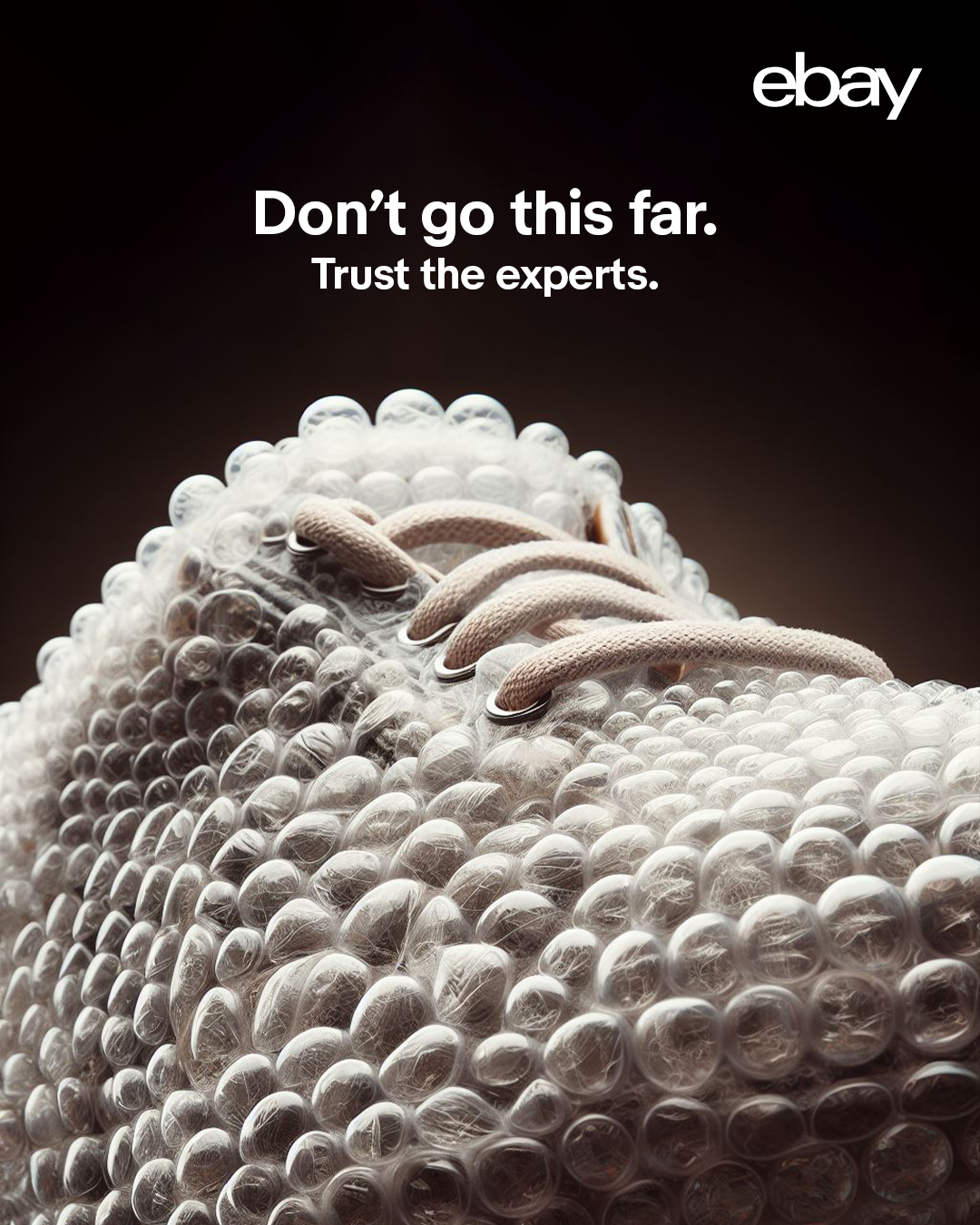 In this visually captivating creative, the concept of 'Export Ka Expert' is ingeniously portrayed. The visual features a single shoe meticulously wrapped in layers of bubble wrap, symbolizing the extra precautions taken by sellers who do not utilize eBay's platform for exporting their products. The accompanying copy, 'Don't go this far. Trust the experts,' succinctly communicates the message that eBay offers a trusted and secure platform for transactions. By highlighting the lengths sellers go to ensure product safety without eBay's assistance, the advertisement cleverly emphasizes the reliability and convenience offered by eBay's expertise in export services.