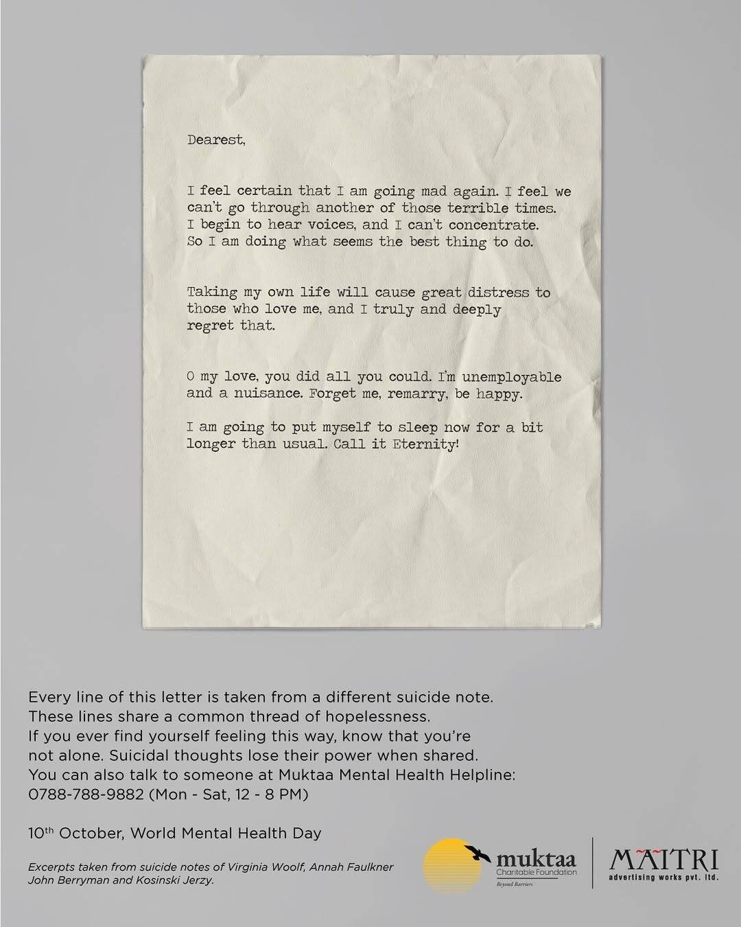 The campaign features a print ad designed as a letter composed of lines from real suicide notes penned by different writers at various times. Although each line comes from a different individual, the overall letter flows seamlessly. The ad underscores a common misconception: many individuals suffering from suicidal thoughts feel isolated in their pain, unaware that millions worldwide are experiencing similar struggles.