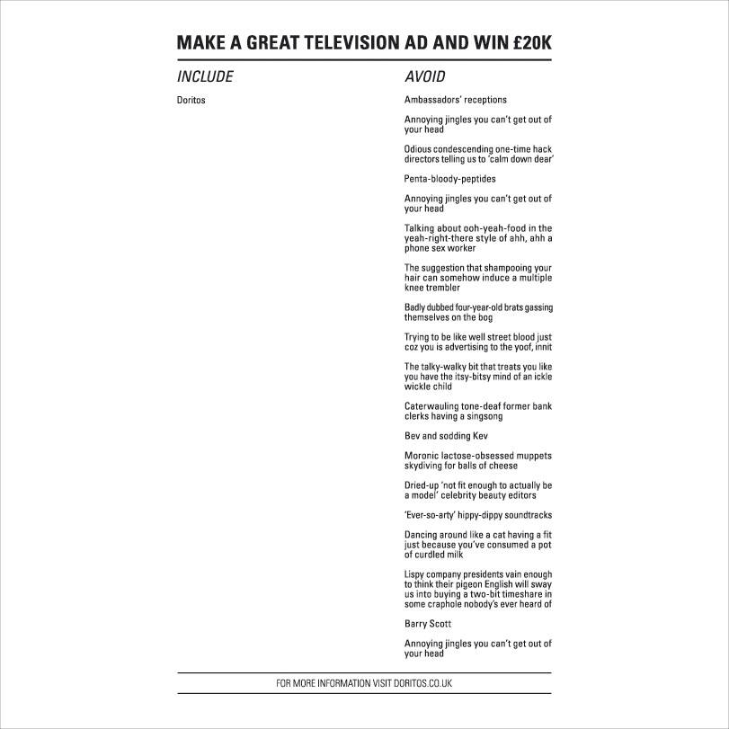 This professional campaign titled 'TV Ad' was published on February 01, 2008. It was created for the brand: Doritos, by ad agency: AMV BBDO. This Print medium campaign is related to the Confectionery, Snacks industry and contains 1 media asset. It was submitted almost 18 years ago.