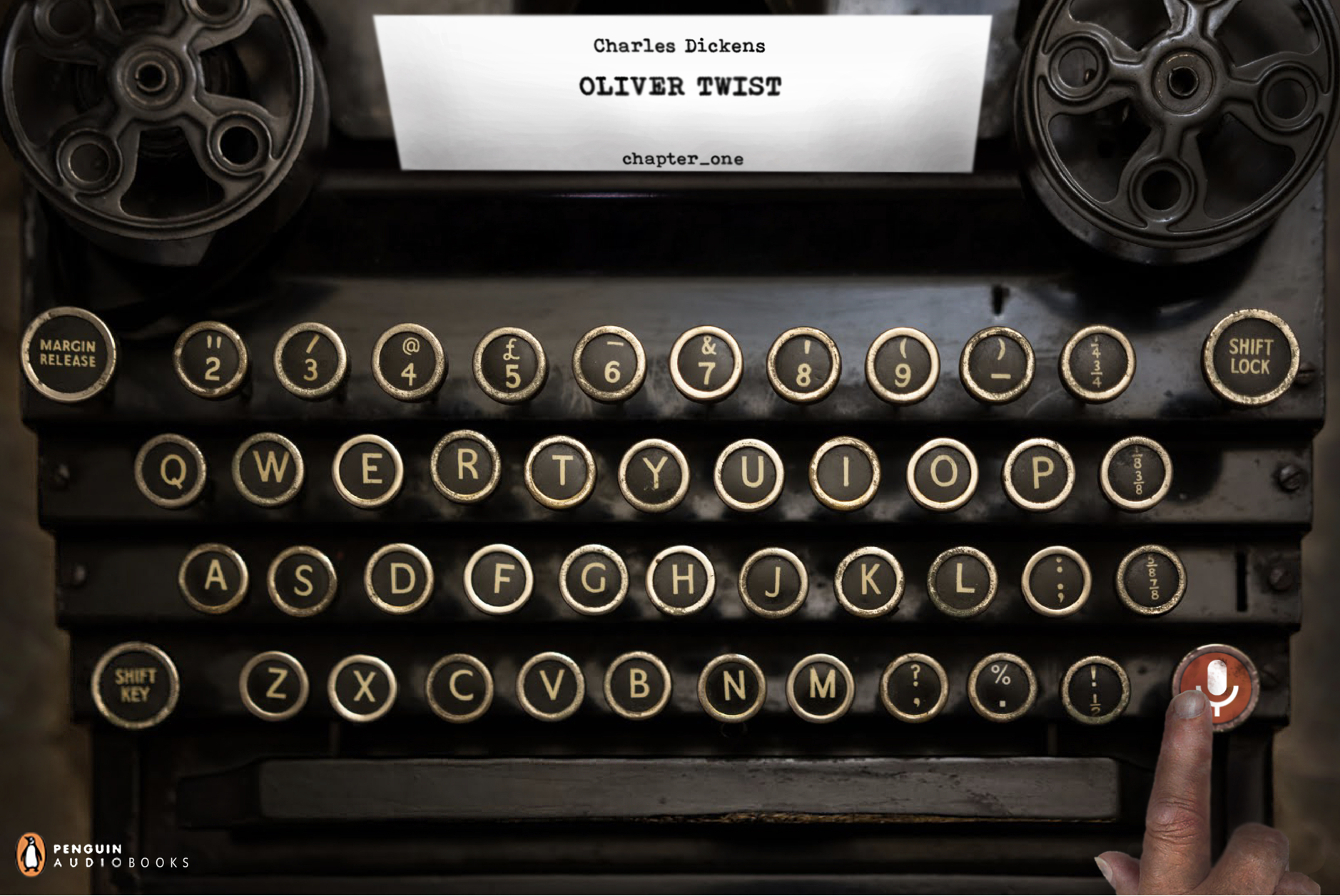 We see an old typewriter with the chapter one of a well known book and in the bottom we also see a mic button to record a note voice.