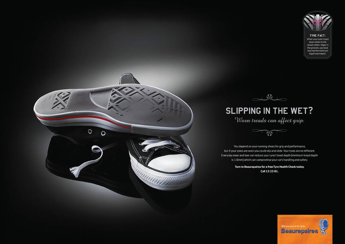 This professional campaign titled 'Tyres are your car's shoes' was published in Australia in May, 2016. It was created for the brand: Beaurepaires, by ad agency: Traffic. This Print medium campaign is related to the Automotive and Personal Transportation industry and contains 3 media assets. It was submitted almost 15 years ago.