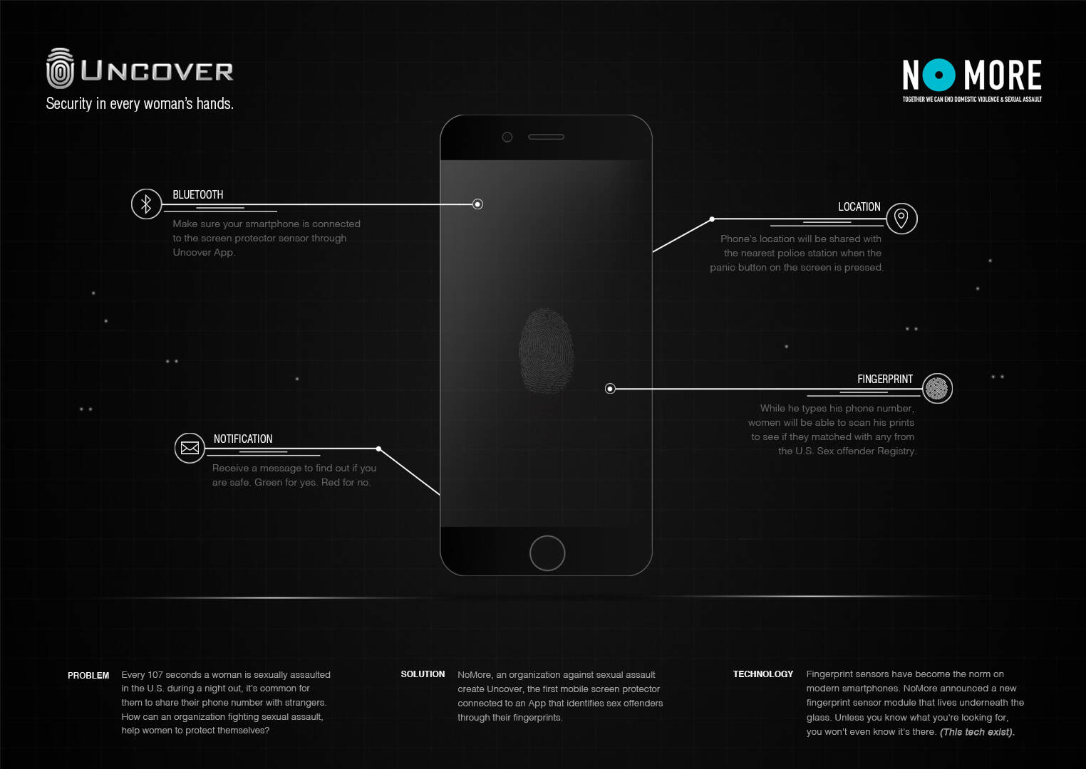 NoMore, an organization working to end sexual assault, create Uncover: a first-of-its-kind phone screen protector that connects to the phone via an app and scans fingerprints when the device is used to type.