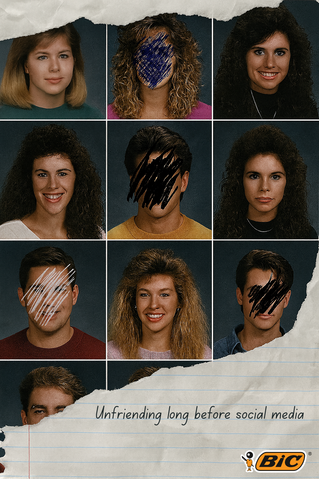 This campaign reimagines how people used to “unfriend” long before digital platforms existed. Using a nostalgic yearbook visual marked with pen scribbles and torn paper textures, it humorously highlights the timeless power of ink to express emotions, whether love, friendship, or frustration.