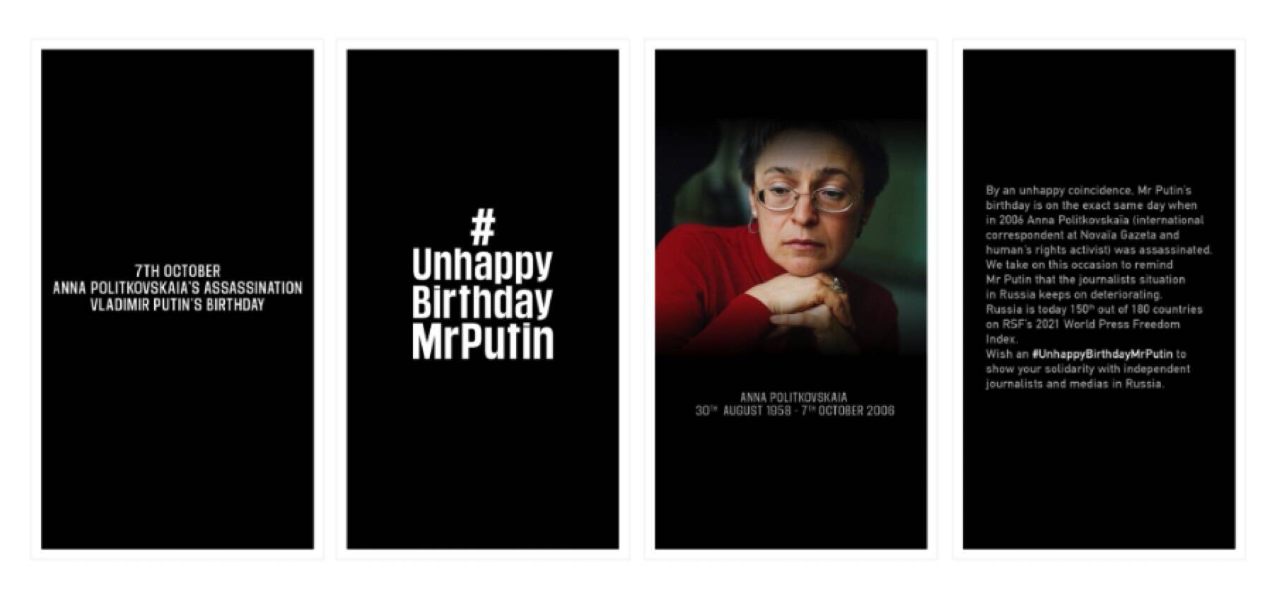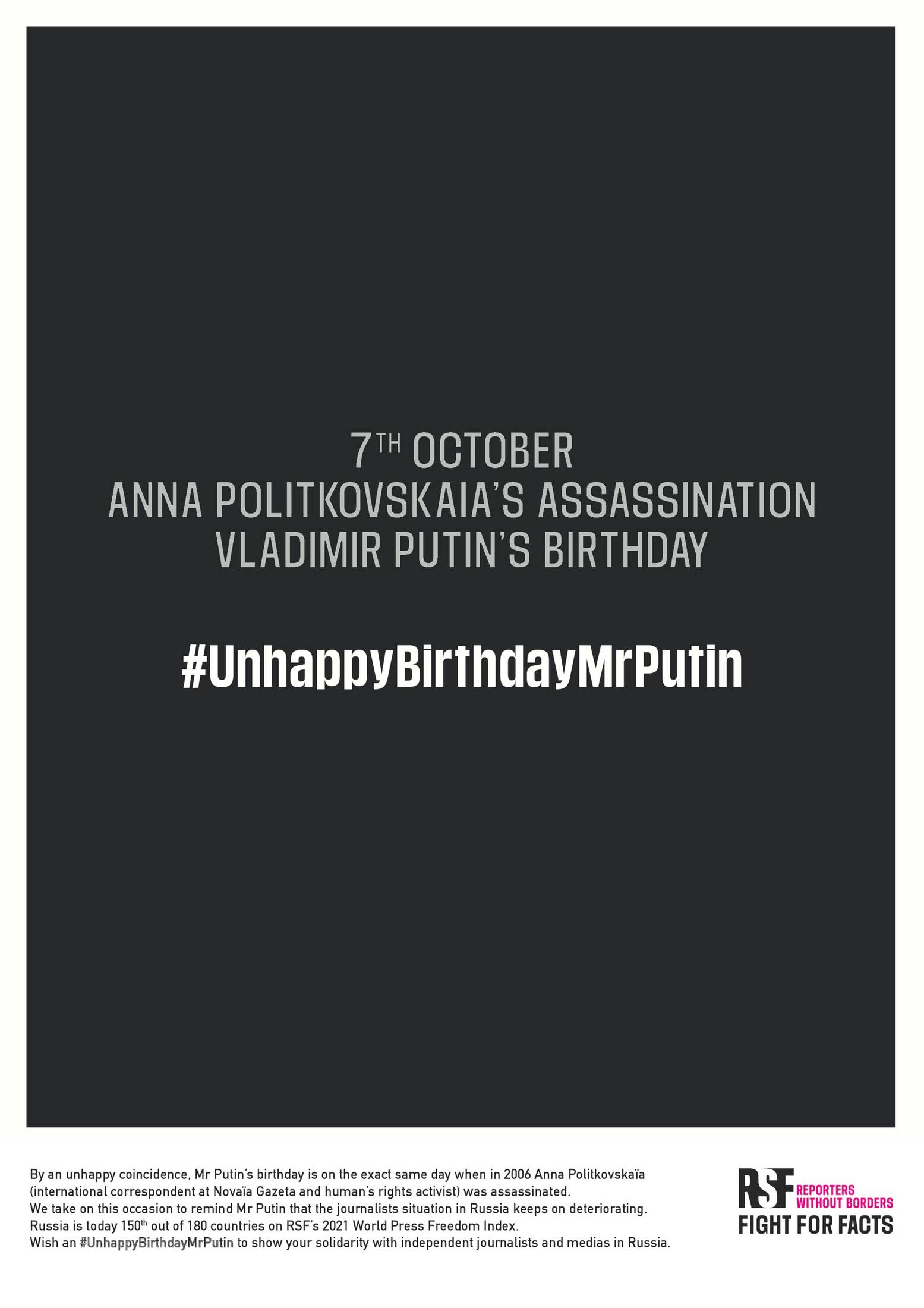 7th October 2021 will mark the 15th anniversary of the journalist Anna Politkovskaïa assassination and the 69th birthday of the Russian president Vladimir Putin’s.If it’s possible to ask oneself about the strange coincidence between these 2 dates, what is sure is that Anna’s fight still continue: the free press has never been so attacked in Russia that in the past few months since the end of the USSR.So this year, we ask the international community not to wish Mr Putin an happy birthday, but rather an #UnhappyBirthdayMrPutin.To commemorate Anna’s memory, to demand that all light is shed on her assassination as the prescription time s coming on the 7th October, that the commendatory are found and that pressure is put on the Russian president so that abuses and threats against journalists in Russia cease.