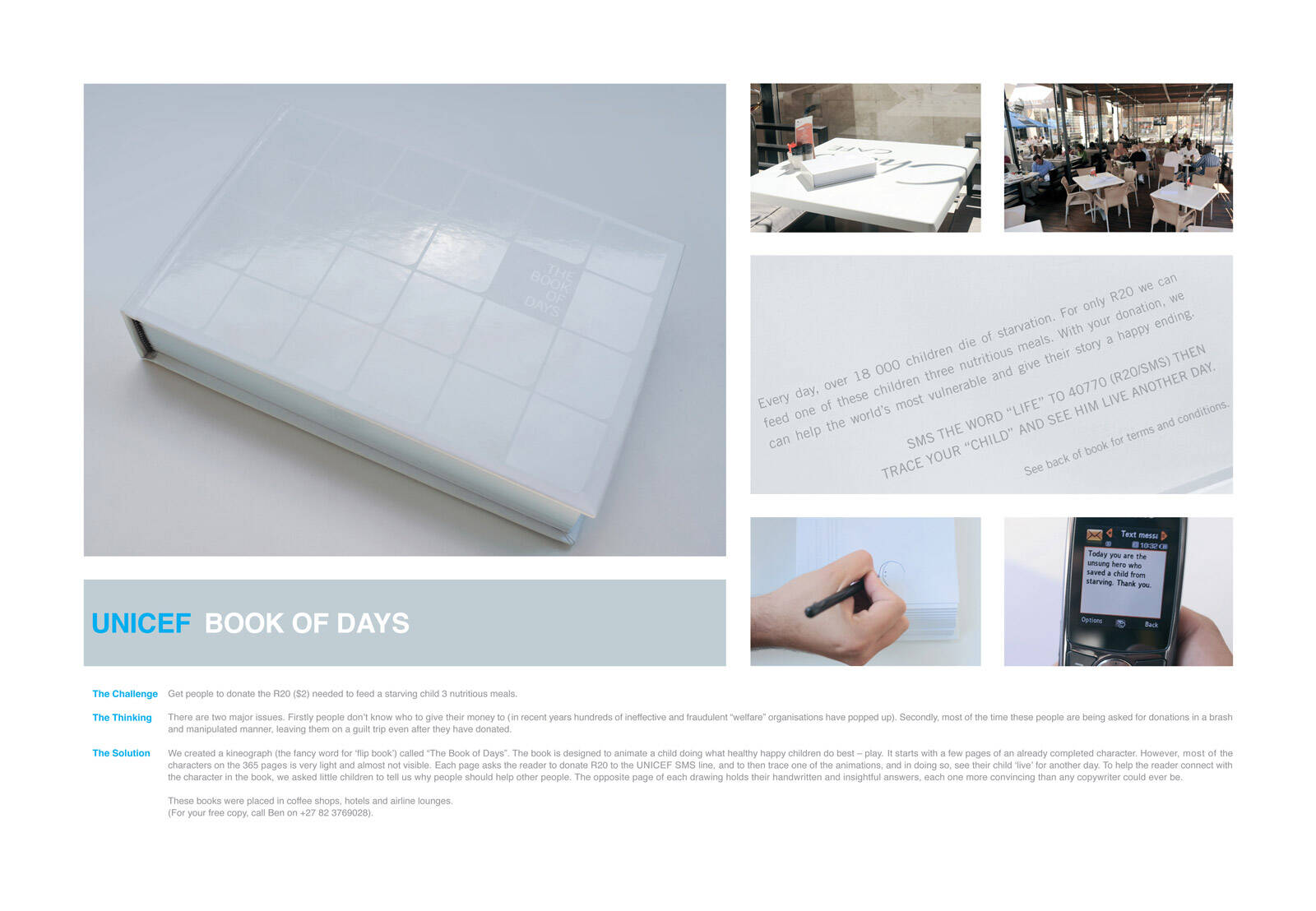 This professional campaign titled 'Unicef Book Of Days' was published in South Africa in May, 2016. It was created for the brand: Unicef, by ad agency: Saatchi & Saatchi. This Ambient medium campaign is related to the Public Interest industry and contains 1 media asset. It was submitted over 16 years ago.