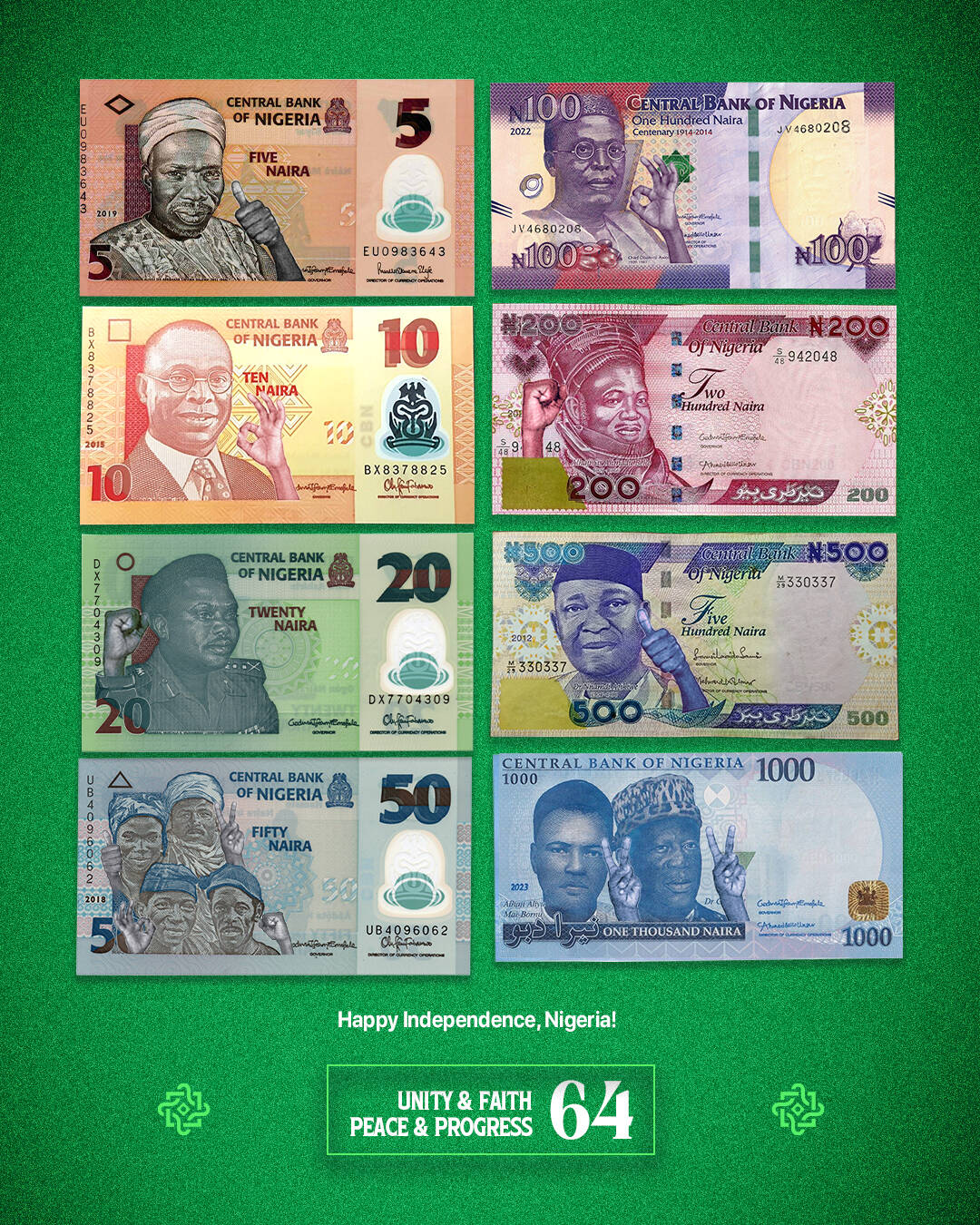 The design combines historical significance with modern visual aesthetics, offering a tribute that is both culturally resonant and visually appealing. The green background ties to the color of the Nigerian flag, while the collage of currency notes and national icons fosters a sense of pride and unity.