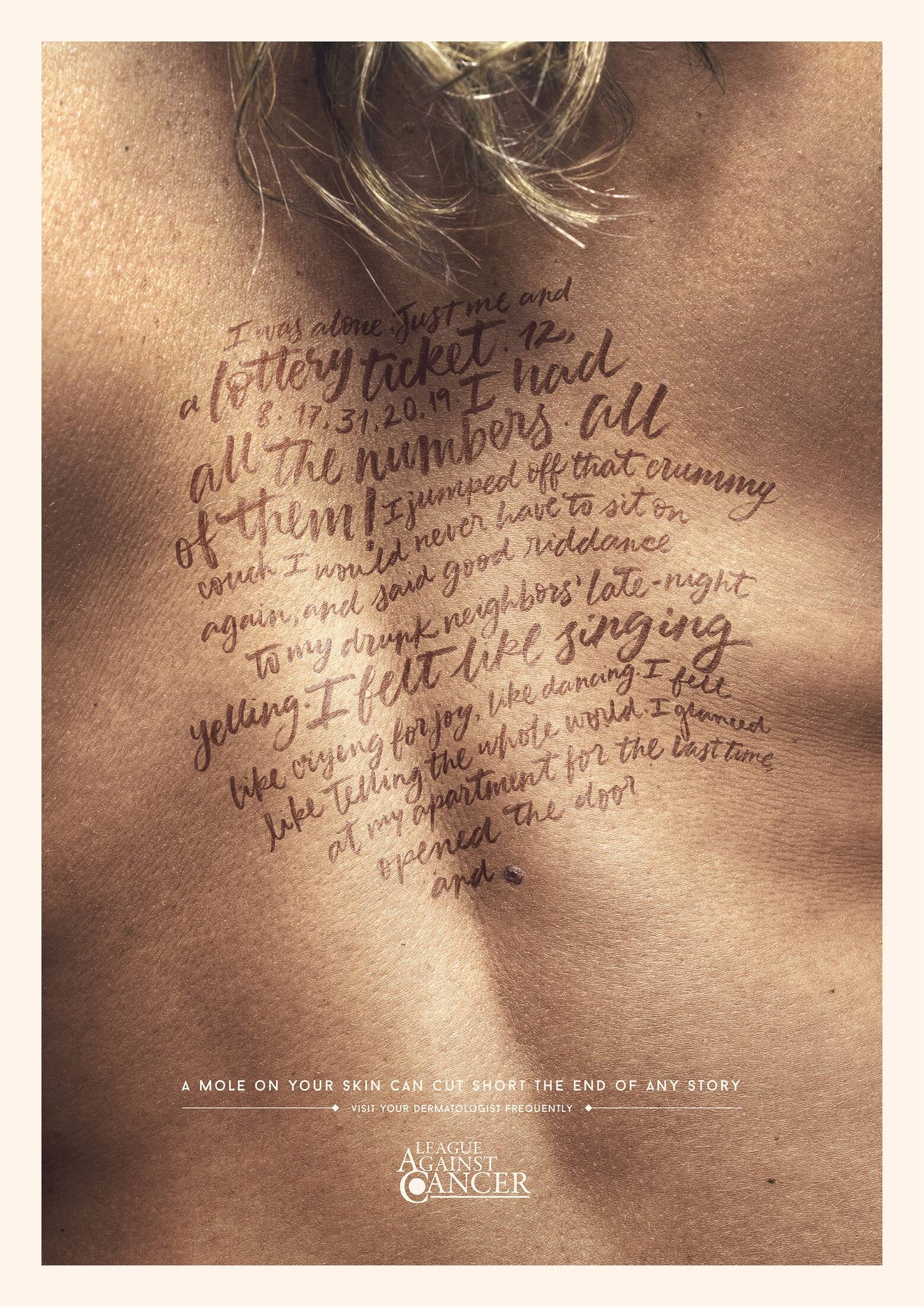 This professional campaign titled 'University, Scriptwriter, Lottery, Captain' was published in Peru in November, 2015. It was created for the brand: League against cancer, by ad agency: Y&R. This Print medium campaign is related to the Public Interest industry and contains 4 media assets. It was submitted over 9 years ago.