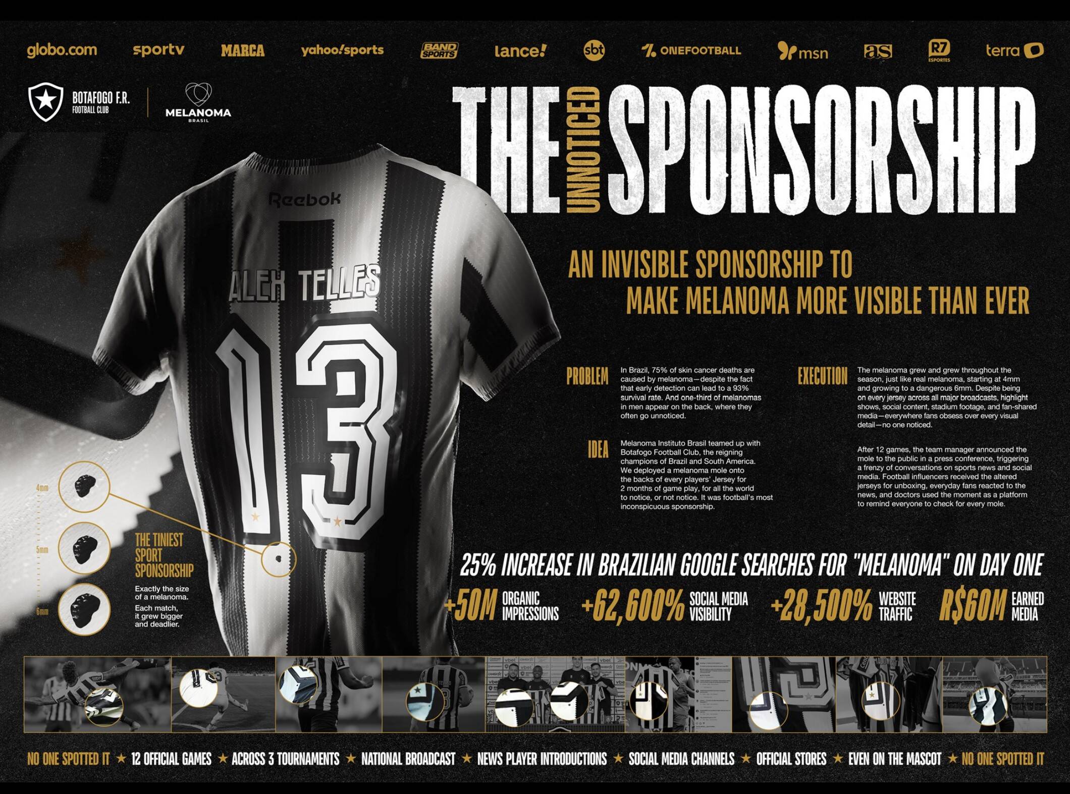 In Brazil, where football culture is obsessive and melanoma is a growing but often overlooked threat, the Brazilian Melanoma Institute needed a way to break through health message fatigue and change behavior. Partnering with iconic club Botafogo, the Institute subverted sports sponsorship by placing a tiny, mole-like dot on the back of players’ jerseys, exactly where 40 percent of melanoma cases occur in men. The mark appeared during major matches for months without explanation, mirroring how melanoma often exists in plain sight yet goes unnoticed.