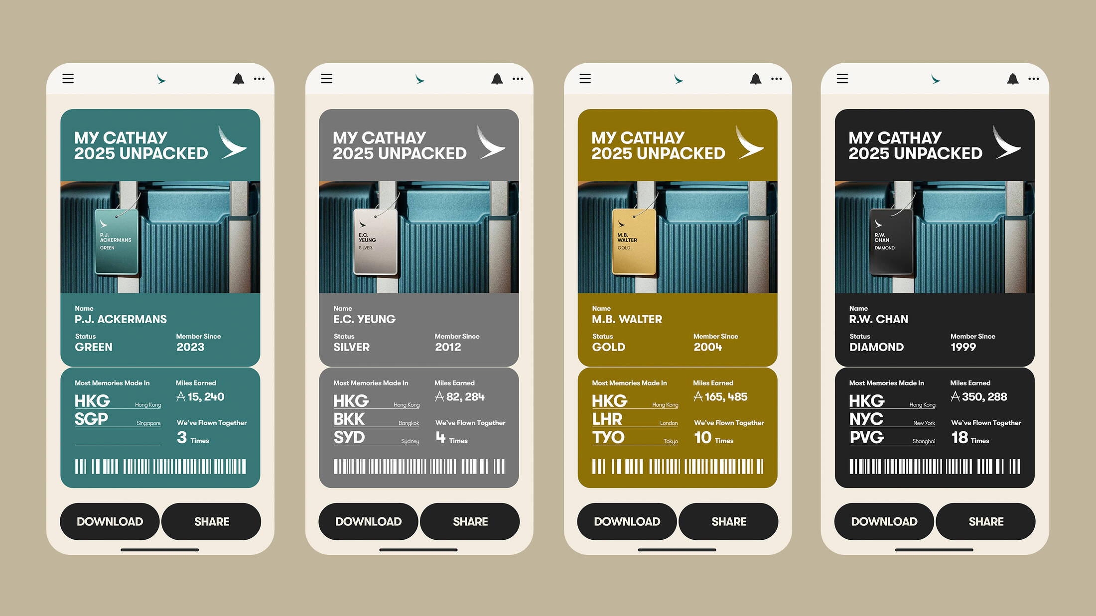 Drawing on complex data from Cathay Pacific flights and Cathay’s lifestyle ecosystem, ‘Unpack Your 2025’ covers all Cathay Pacific destinations, chronological travel data, and design elements tailored to each membership tier.