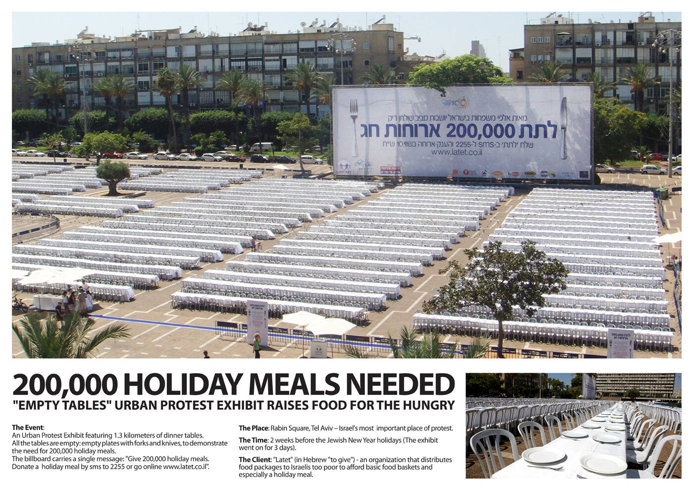 An Urban Protest Exhibit featuring 1.3 kilometers of empty dinner tables to raise 200,000 holiday meals.