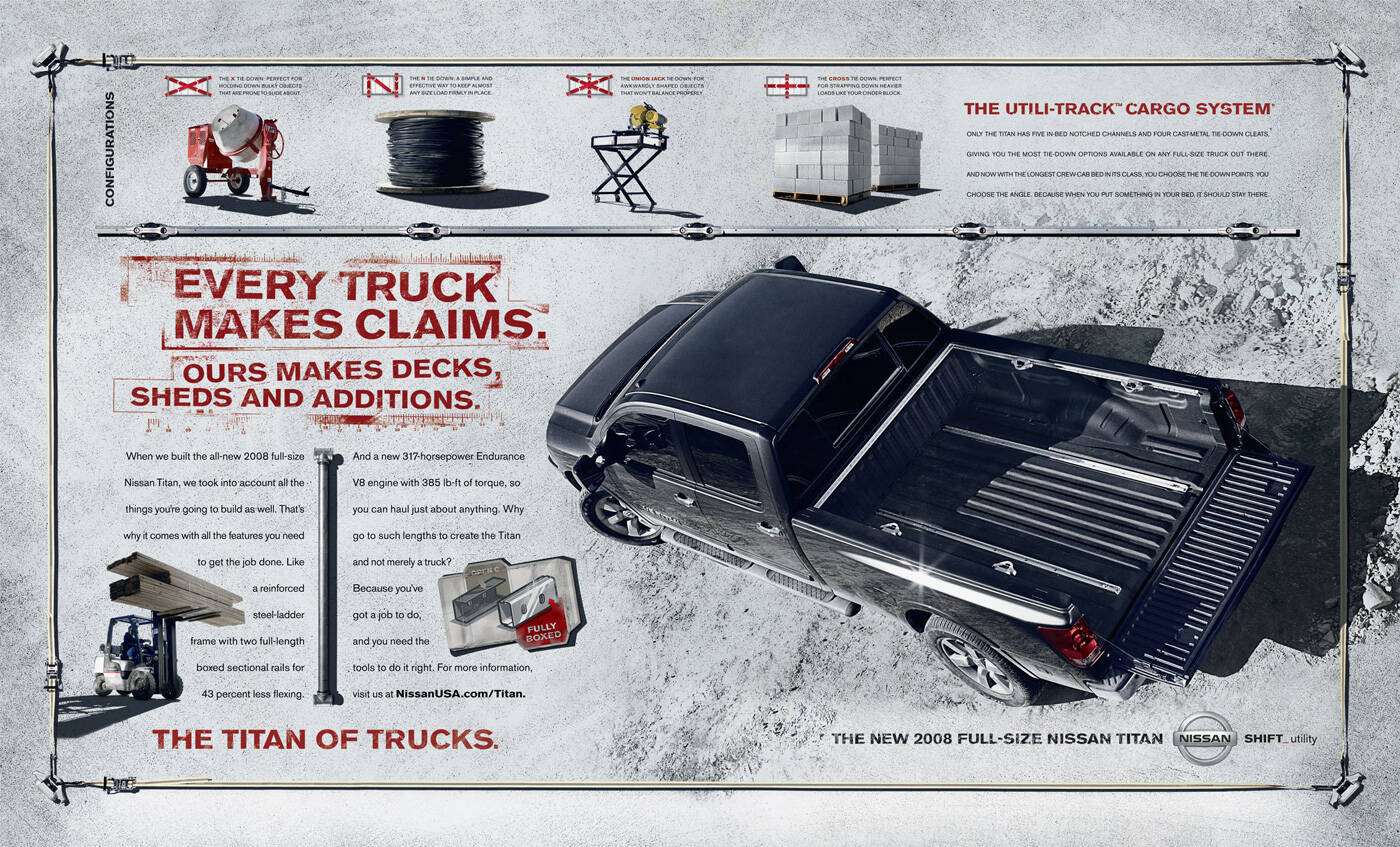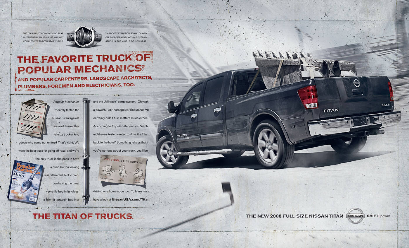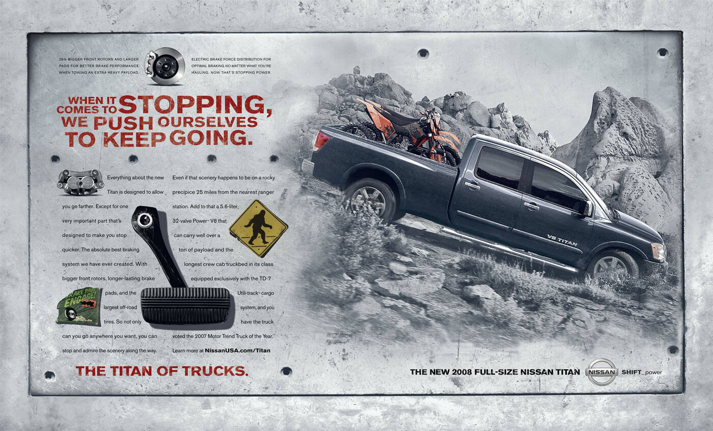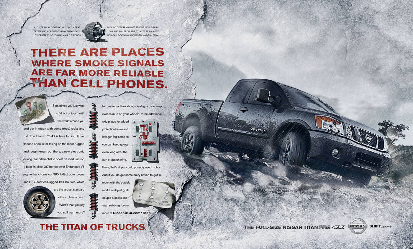 This professional campaign titled 'Utility, Popular mechanics, Cell phones, Brakes' was published in United States in November, 2008. It was created for the brand: Nissan, by ad agency: TBWA. This Print medium campaign is related to the Automotive and Personal Transportation industry and contains 4 media assets. It was submitted about 17 years ago.
