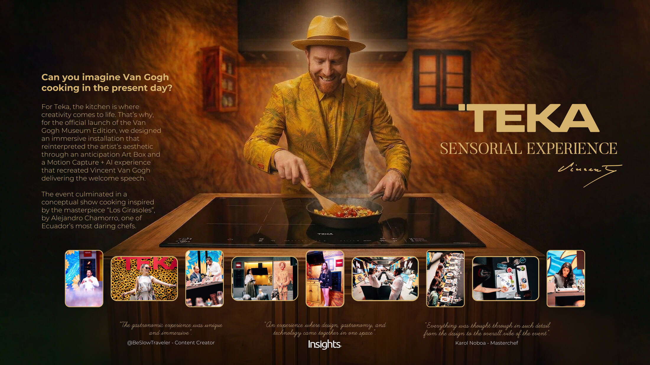 For Teka, the kitchen is where creativity comes to life. That’s why, for the official launch of the Van Gogh Museum Edition, we designed an immersive installation that reinterpreted the artist’s aesthetic through an anticipation Art Box and a Motion Capture + AI experience that recreated Vincent Van Gogh delivering the welcome speech. The event culminated in a conceptual show cooking inspired by the masterpiece “Los Girasoles”, by Alejandro Chamorro, one of Ecuador’s most daring chefs.