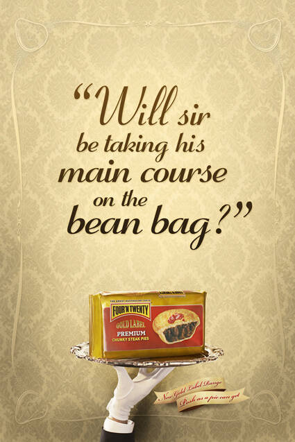 This professional campaign titled 'Vintage, Tracky dacks, Bean bag' was published in Australia in March, 2008. It was created for the brand: Four’n Twenty, by ad agency: BBDO. This Print medium campaign is related to the Food industry and contains 3 media assets. It was submitted almost 18 years ago.