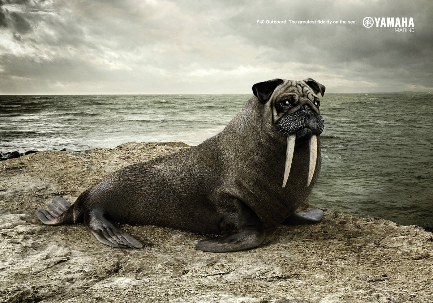 Yamaha Outboards ensure the maximum fidelity whatever the conditions of the sea. Reliability is represented by a Waldog, mash-up between a dog and a walrus.