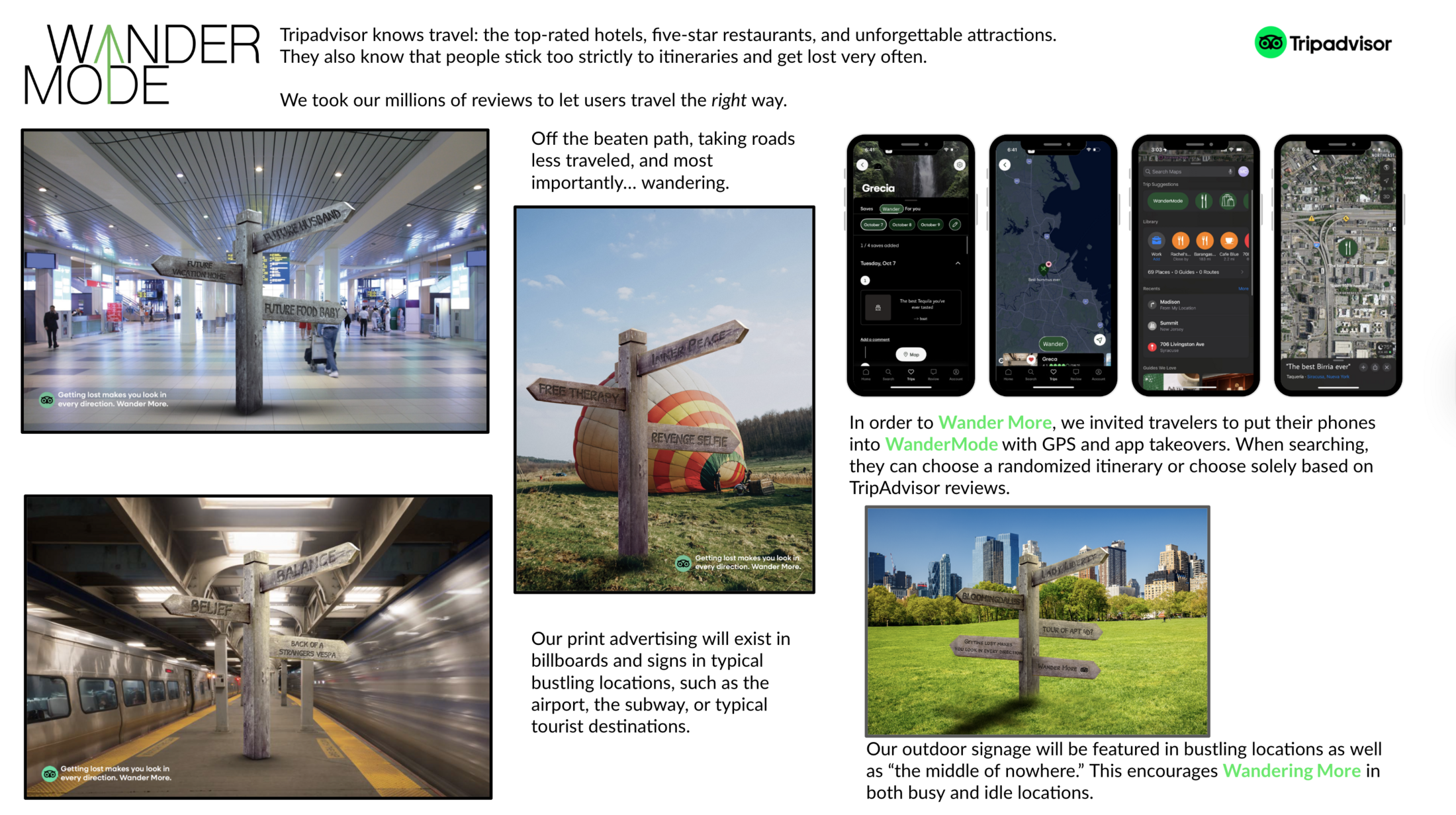 TripAdvisor is encouraging users to Wander More when they travel. Off the beaten path, exploring the unknown, and finding the world's best tacos. They also encouraged users to put their accounts into WanderMode, scrambling GPS locations, creating new itineraries, and leading aimlessly.