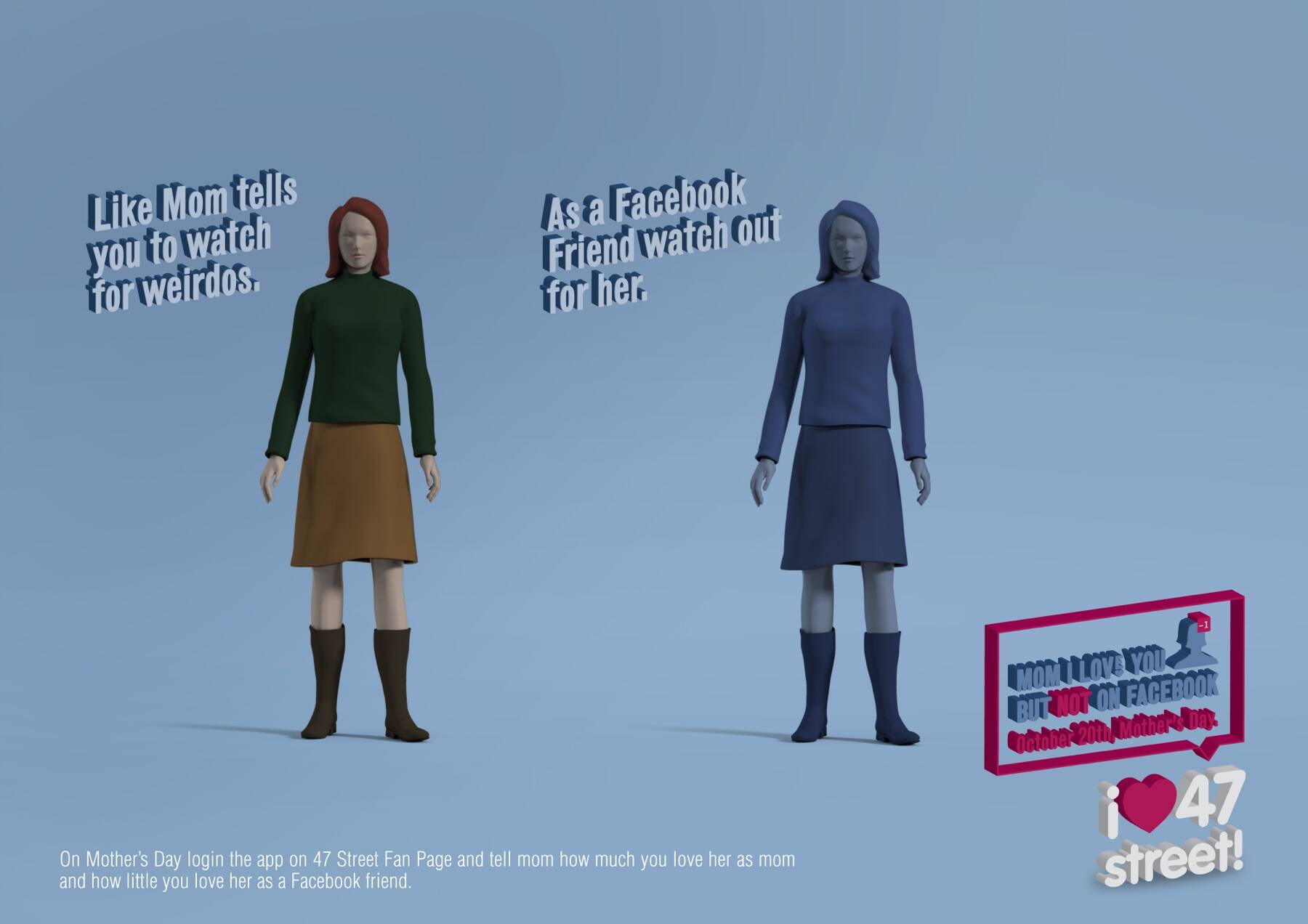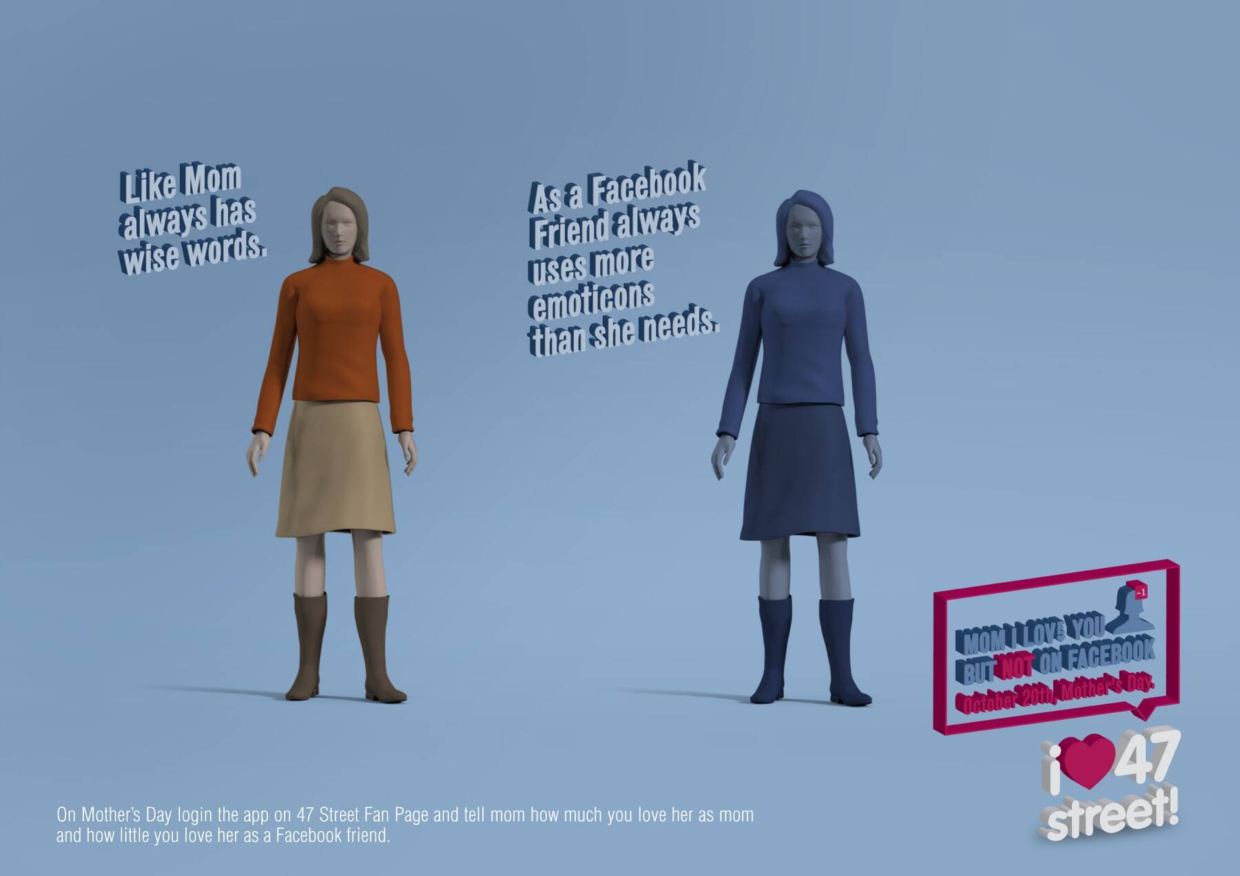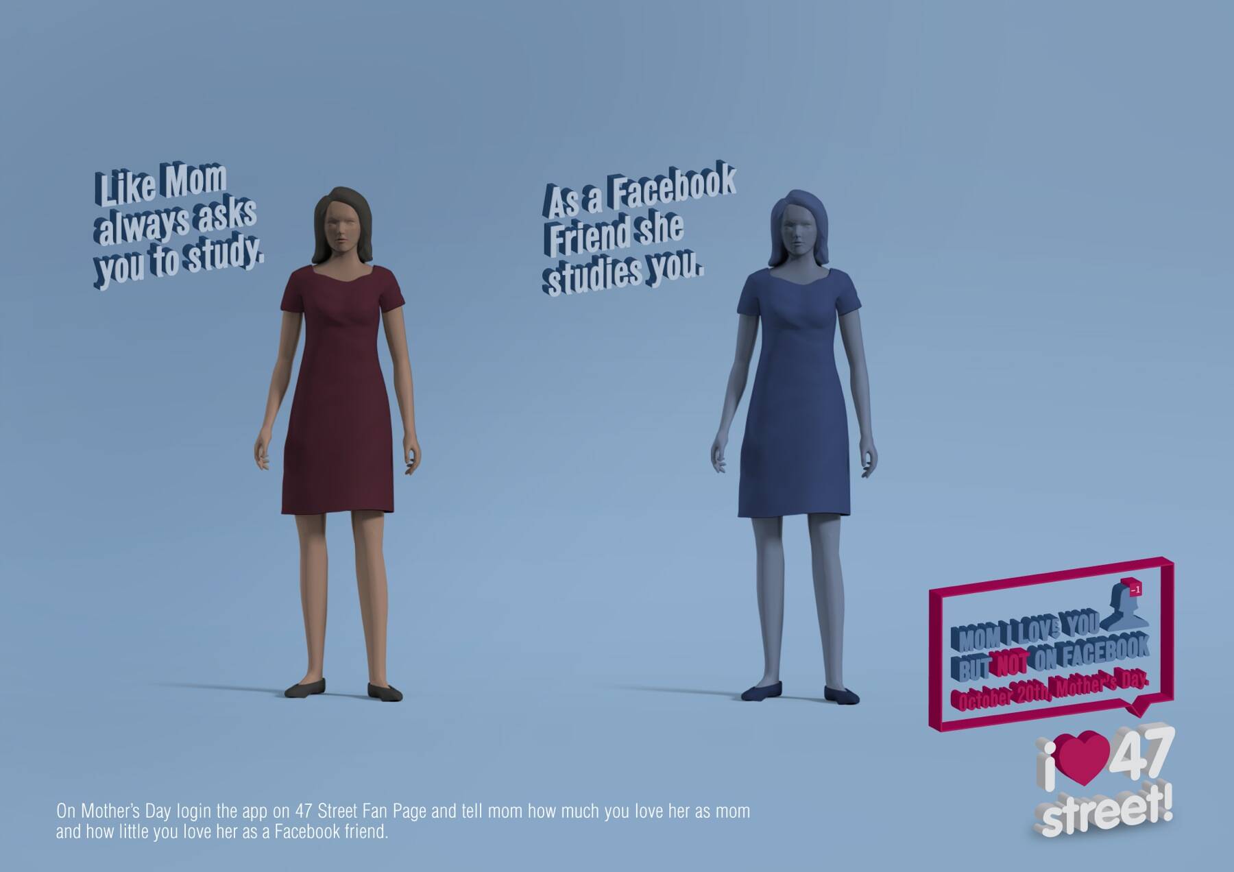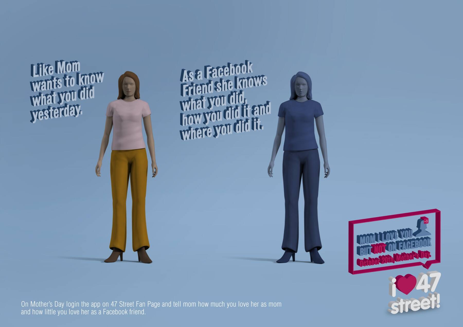 47 Street is a recognized clothing brand for teenage girls. For Mother’s Day we created an app on Facebook where daughters could tell their moms that they loved them as Mothers but not as Facebook friends.