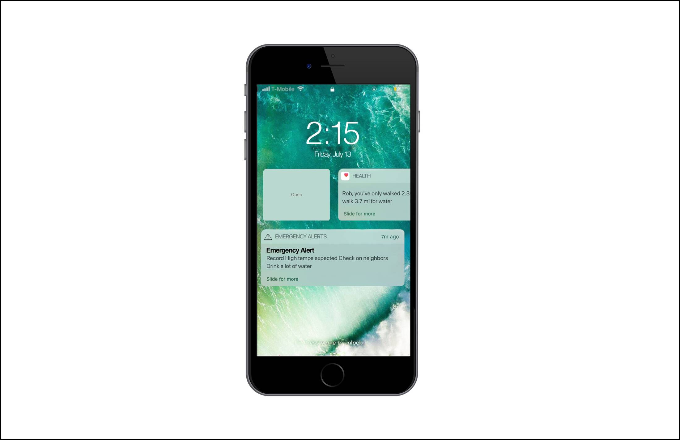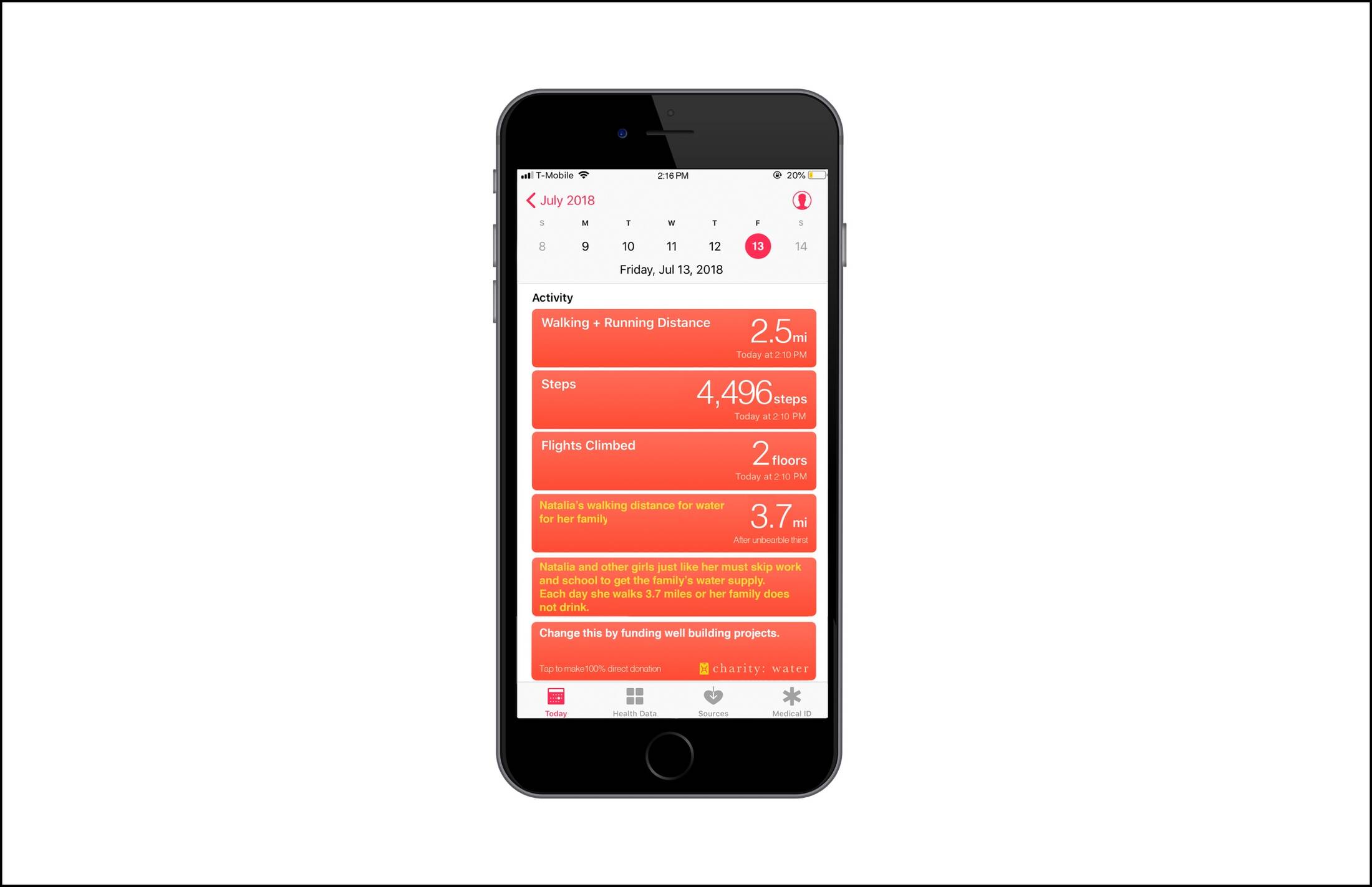 Digital partnership with factory installed Apple’s Health app. Users who share their data and enable push notifications will receive a notification on the hottest predicted day of the year. The user will be serviced the ad if he or she have not accumulated at least 3.7 miles worth of steps. When swiped, it will launch the Health App. The user's normal fitness stats are displayed as always. Underneath, the distance a girl whom has to walk 3.7 miles for water each day. Below, the stat will be explained. At the bottom, is a call to fund water well building projects with a link to donate.