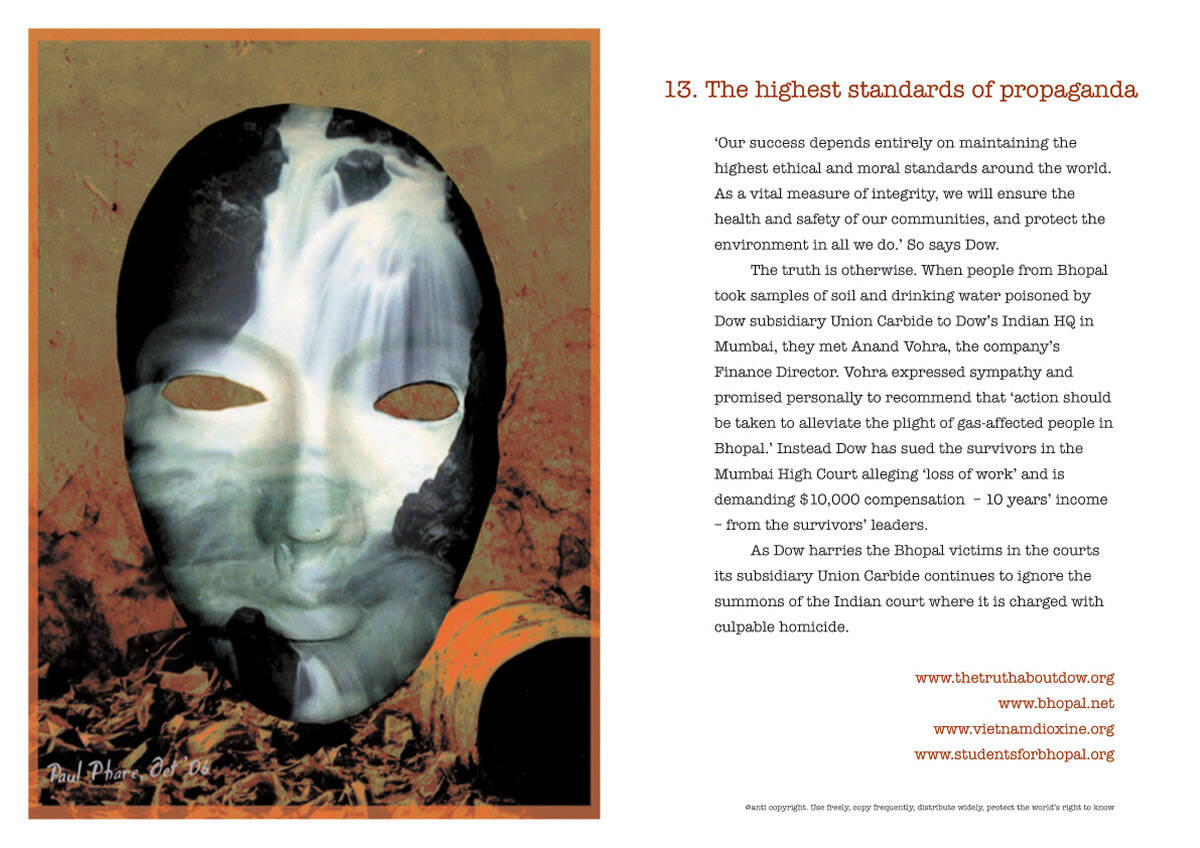 Paul Phare's series of artworks, "A glimpse behind the mask of Dow" is a personal response to Dow Chemical's "human element" advertising campaign, on which Dow has spent $30 million. As those harmed by Dow's poisons are some of the poorest, most helpless people on the planet, they can't match this spend, but they have something more valuable than dollars. They have you. Please download these posters and spread them widely.