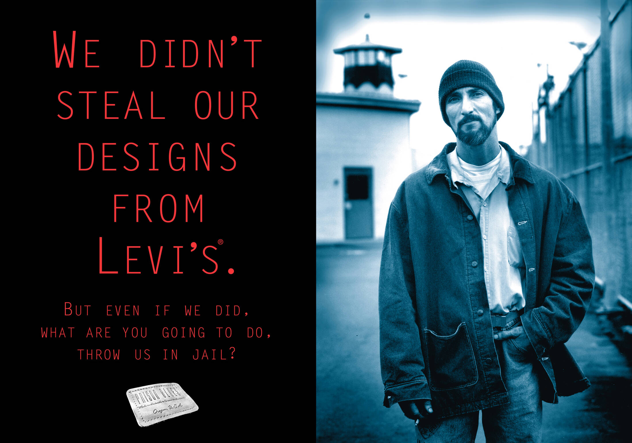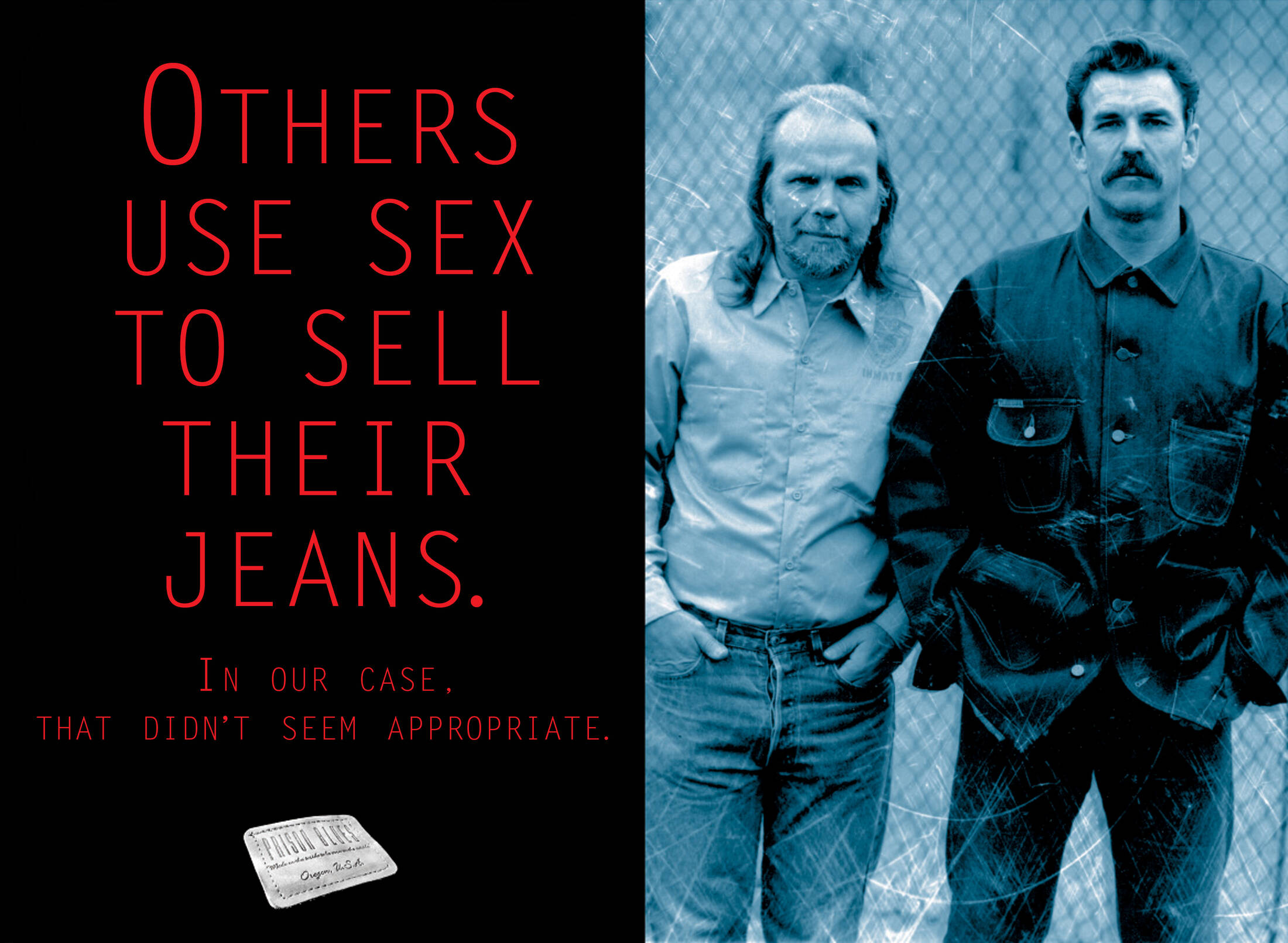 These ads were part of a hard hitting "tongue in cheek" campaign to support the sale of blue jeans made by inmates at the Oregon State Penitentiary. The program allowed inmates to earn a commensurate rate to outside garment workers, while paying taxes, supporting families, paying victims restitution, and having money available for when they got out of prison. Also, for most, it was their first experience interviewing for a job, learning a skill, and developing a work ethic that would translate to the outside world. After 5 years of existence, the program had zero percent recidivism, (inmates who left the prison and did not return) while the national average hovers around 70%.