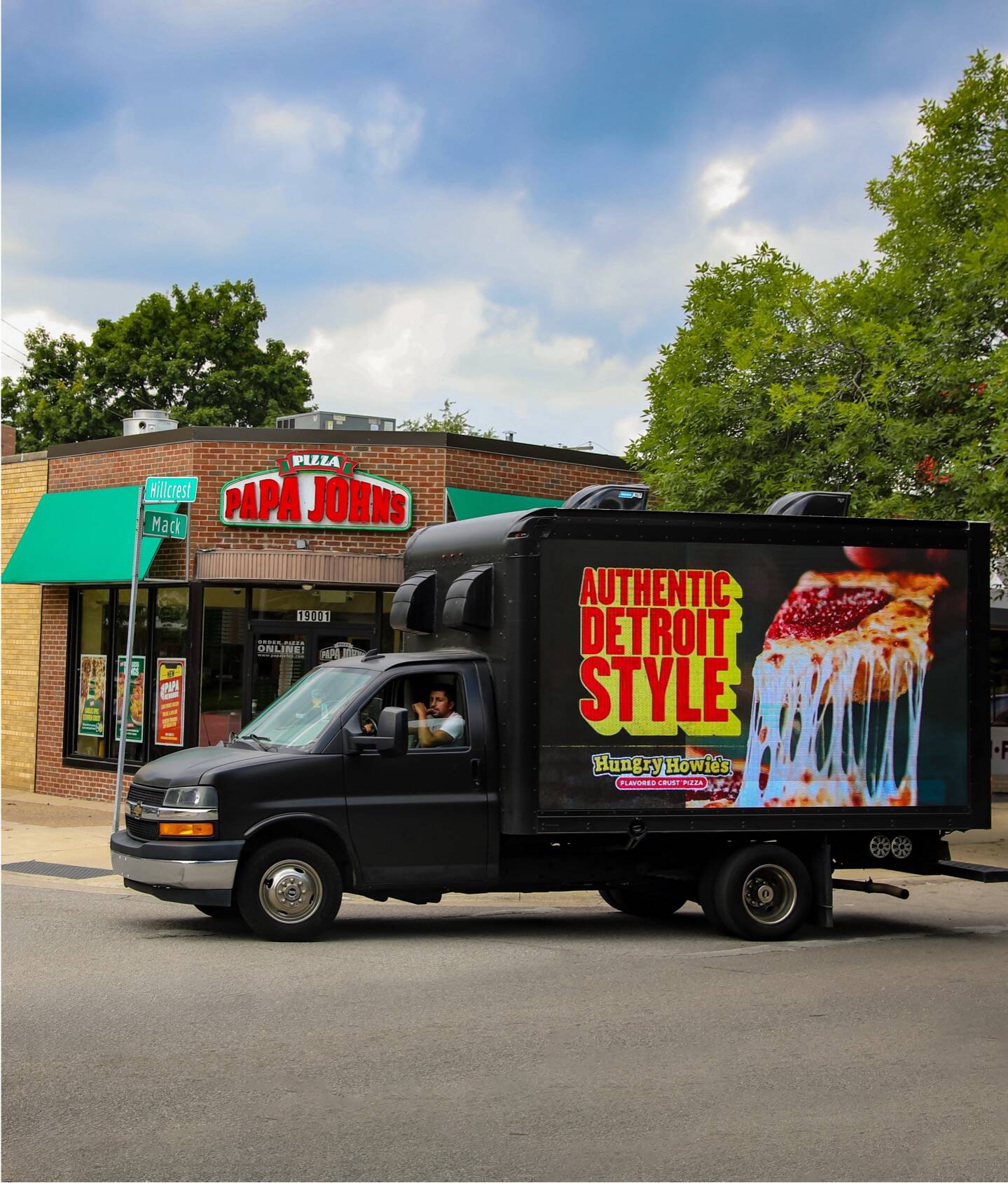 Taking on the competition, the eye-catching digital trucks highlighted Hungry Howie’s authentic Detroit-style pizza with messaging like “There are a lot of fakes out there” and “Authentic Detroit Style.”