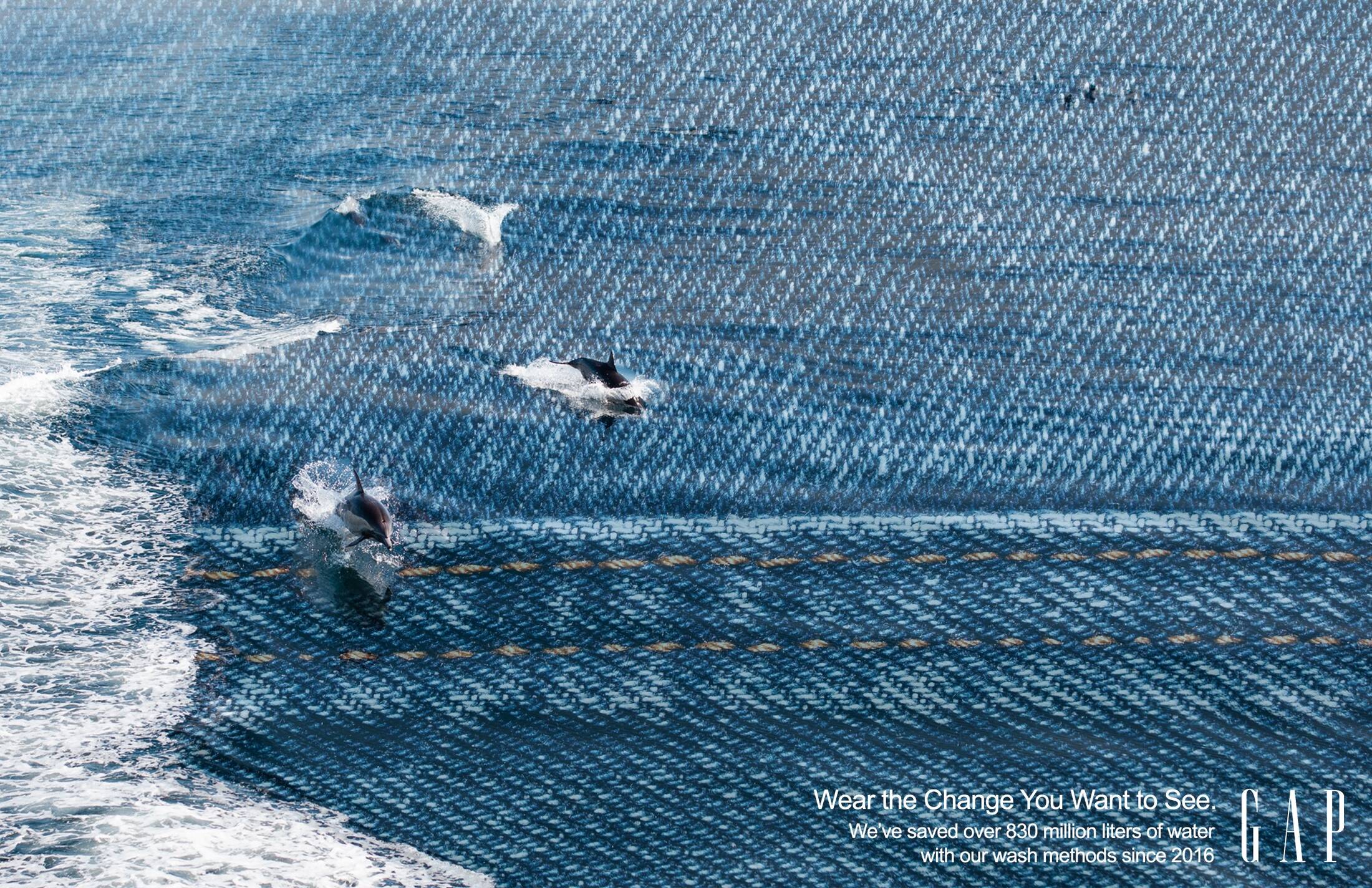 “Wear The Change,” is a positive message and visual representation of the powerful impact sustainable fashion has on our planet. The campaign combines denim with water to promote Gap’s Washwell program, which uses at least 20% less water than conventional wash methods.