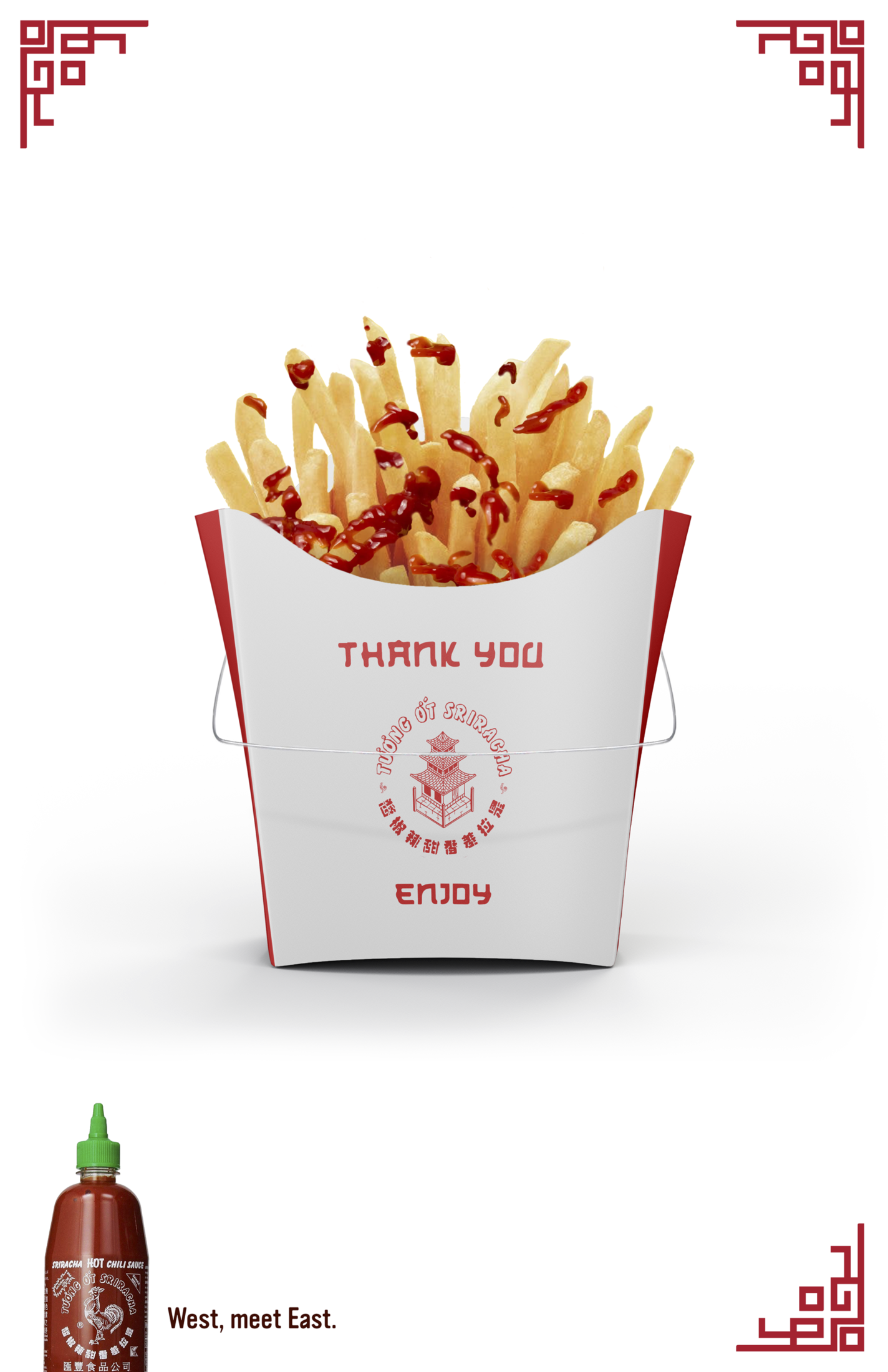 Sriracha Hot Chili Sauce is a hot sauce that has ambiguous Eastern roots. The goal of this campaign is to make the connection to consumers that they should use Eastern hot sauce on Western food, and to further hammer that Sriracha is good on everything; a cultural collision. Unlike other hot sauces, this is Sriracha's greatest asset, its diverse appeal, not its heat. Popular Western foods are packaged in iconic Asian takeout packaging to convey this concept and forced connection. The copy is a turn on the common phrase "Where East Meets West," to "West, Meet East," to display their introduction.