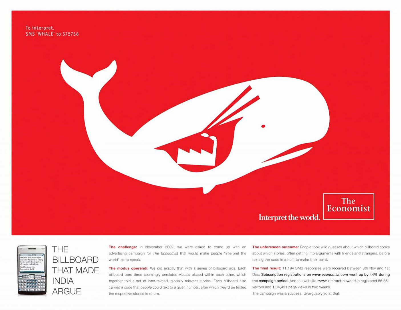 This professional campaign titled 'Whale, Baby' was published in India in June, 2010. It was created for the brand: The Economist, by ad agency: Ogilvy. This OOH Outdoor medium campaign is related to the Media industry and contains 2 media assets. It was submitted over 15 years ago.