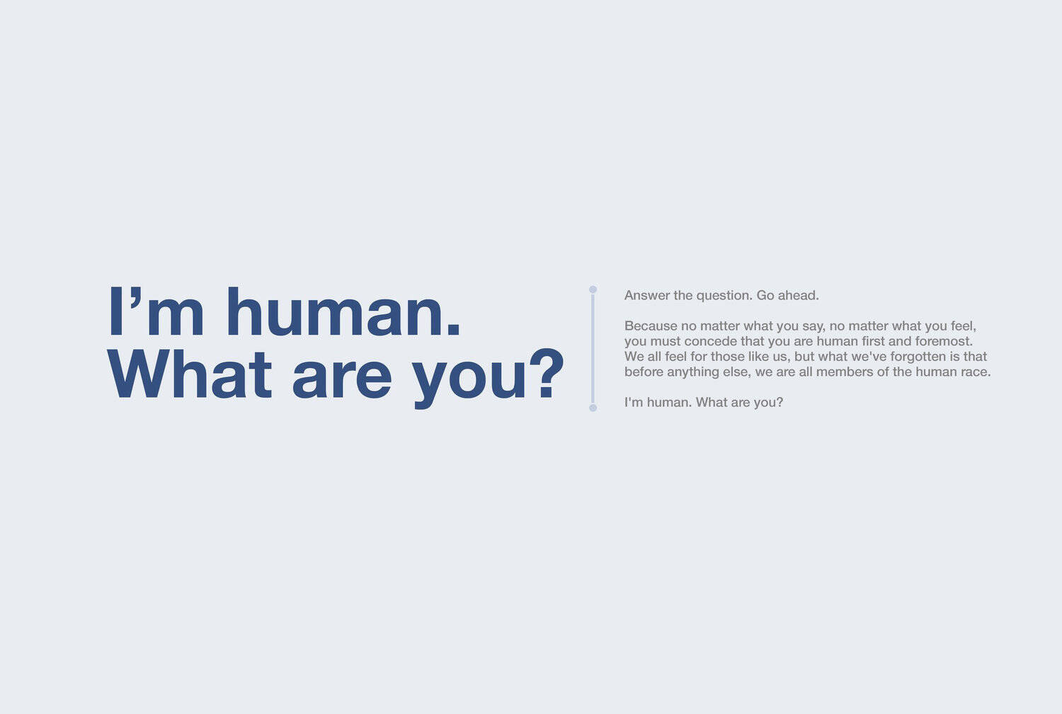 This student campaign titled 'What are you?' was published in United States in June, 2017. It was created for the brand: imhuman, by ad school: Miami Ad School. This Integrated medium campaign is related to the Public Interest industry and contains 5 media assets. It was submitted over 8 years ago.